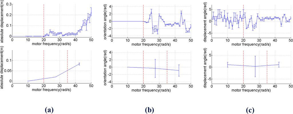 A similar pattern is shown by, i.e., it increases as the frequency gets higher. It can therefore be seen that while the displacement magnitude, i.e., absolute velocity, increases as the frequency increases, the standard deviation of the displacement angle and orientation angle tend to decrease. The difference between and between the two last range of frequency is statistically significant with significance level 0.01. When the frequency gets even higher than 50 rad/s, becomes even larger, and as a result the robot becomes unstable, i.e., the tip of the beam will hit the ground after a particular period of time.