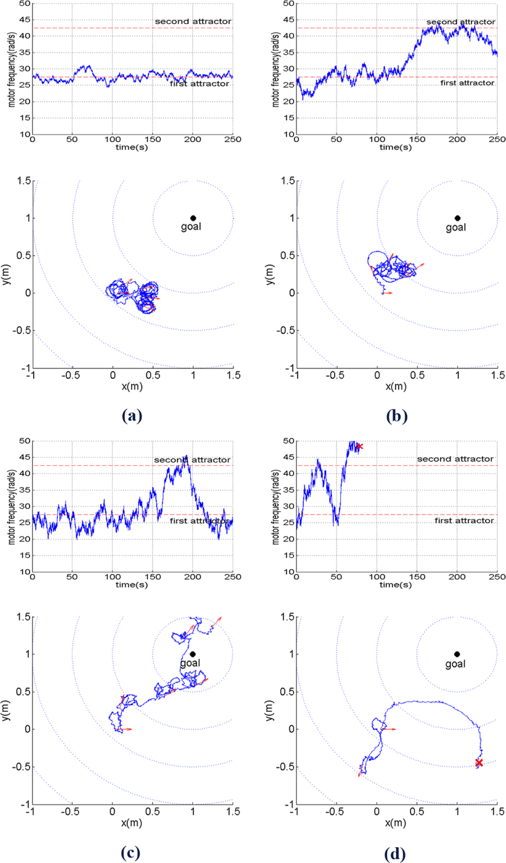 With an approriate level of noise, i.e., σ(ε(t)) = 150, the fluctuation of ω(t) enables the robot to fully take advantage of its two behavioral primitives. As shown in Figure 8c, the robot adequately explores the two behavioral primitives in order to bring itself towards the goal. When the noise level is even larger, i.e., σ(ε(t)) = 200, ω can quickly reach very low or high values. However, due to a high probability to reach very high values of motor frequency, i.e., ω(t) > 50, the probability that the robot will become unstable, i.e., the robot tip hits the ground, also grows as shown in Figure 8d.