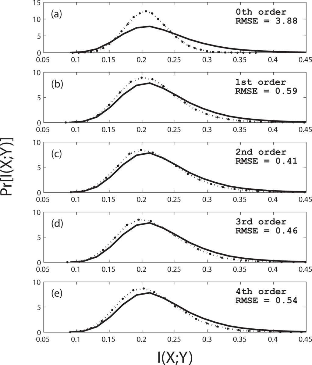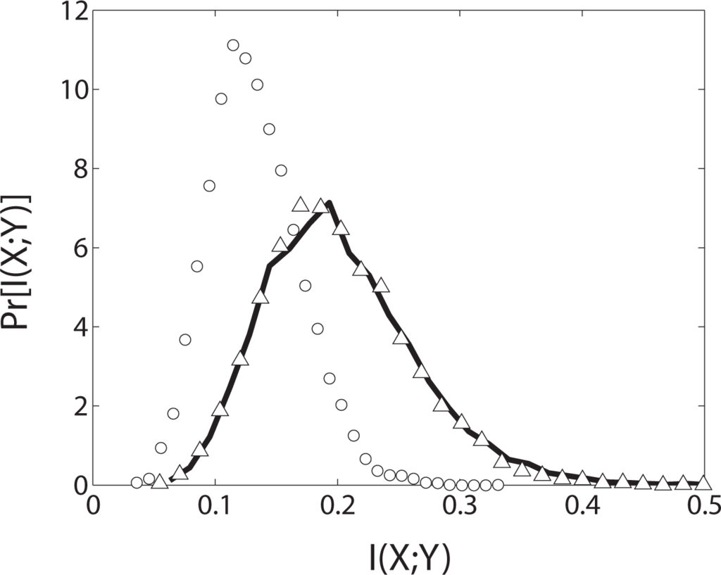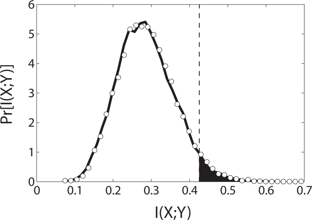 In Figure 1 we plot the result of a numerical simulation of 10, 000 trials of 75 rolls each; the horizontal axis is I(X; Y) and the vertical axis is the probability distribution. The marginals p(x) and p(y) in Equation (1) are estimated by counting the number of occurrences of each of the six symbols {1, 2, 3, 4, 5, 6} for each die and dividing by the total size of the dataset (75). Similarly, the joint probability p(x, y) is obtained by counting the number of occurrences of each of the possible die value pairs, symbols {(1, 1); (1, 2),…, (6, 6)}, divided by the total dataset size. Bias correction is typically employed in practice [7]; however the issue of estimation accuracy is separate from significance testing. The procedure we give here for significance testing is applicable for any choice of bias correction.