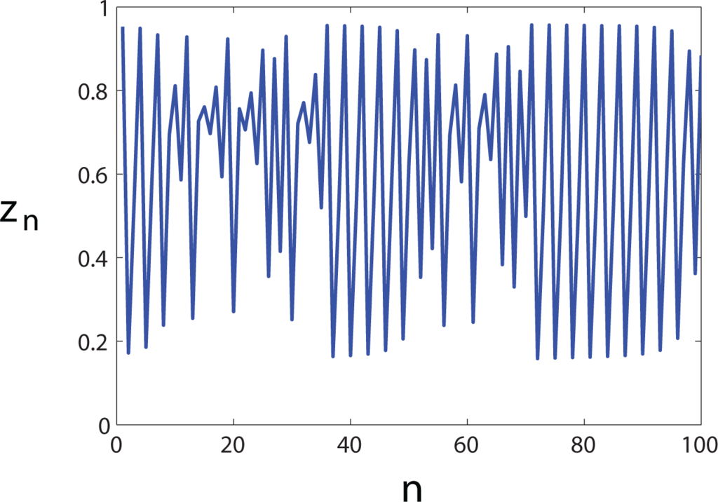 Our algorithm enables the investigator to produce surrogates of a given order but introduces another issue: finding the Markov order of the data. To illustrate, let us take the X and Y processes to be independent instantiations of the logistic map, zn+1 = rzn(1 − zn), where r = 3.827 is in the intermittent chaos regime (Figure 3). For the purpose of computing the mutual information using Equation (1), we partition the interval [0, 1] into 10 equally sized bins and collect statistics from time series of 250 samples. Unlike the previous example, the partitioned logistic map data does not correspond to a Markov process of definite order.