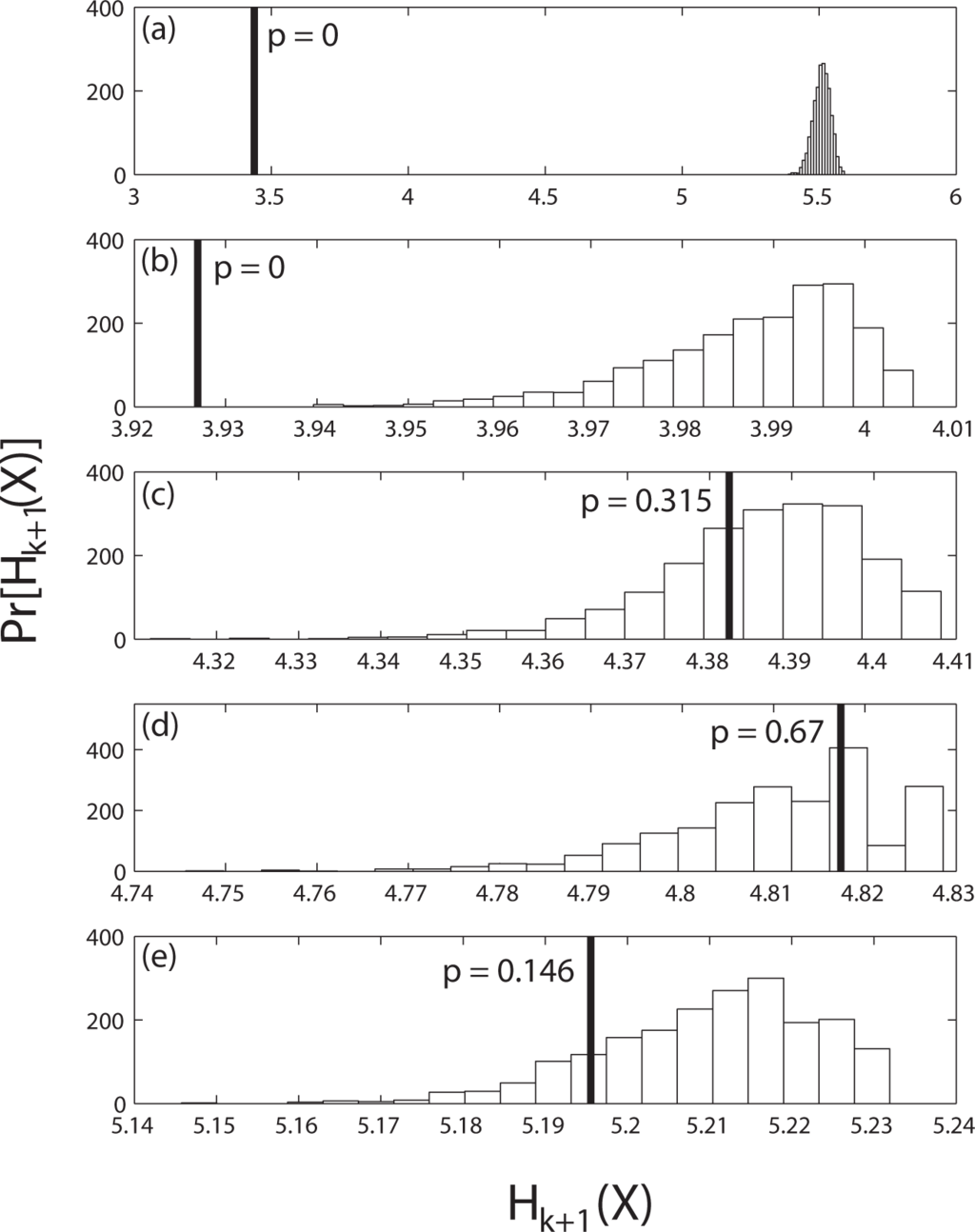 The results of the significance tests for orders k = 0, 1, 2, 3, 4 are shown in Figure 5. The horizontal axes are the block entropies for length k + 2 words. The heavy vertical line indicates the observed block entropy and the bars represent the distribution of the entropies obtained from the surrogates of order k. The p-value, shown next to the vertical line, is the fraction of the surrogate block entropy distribution that lies below the observed block entropy.