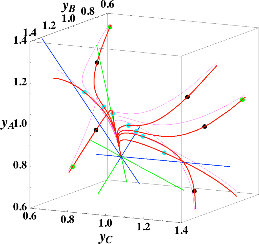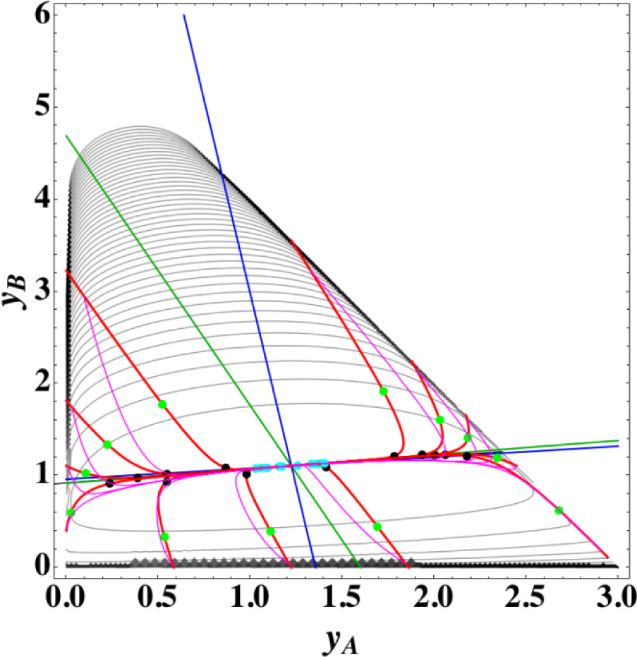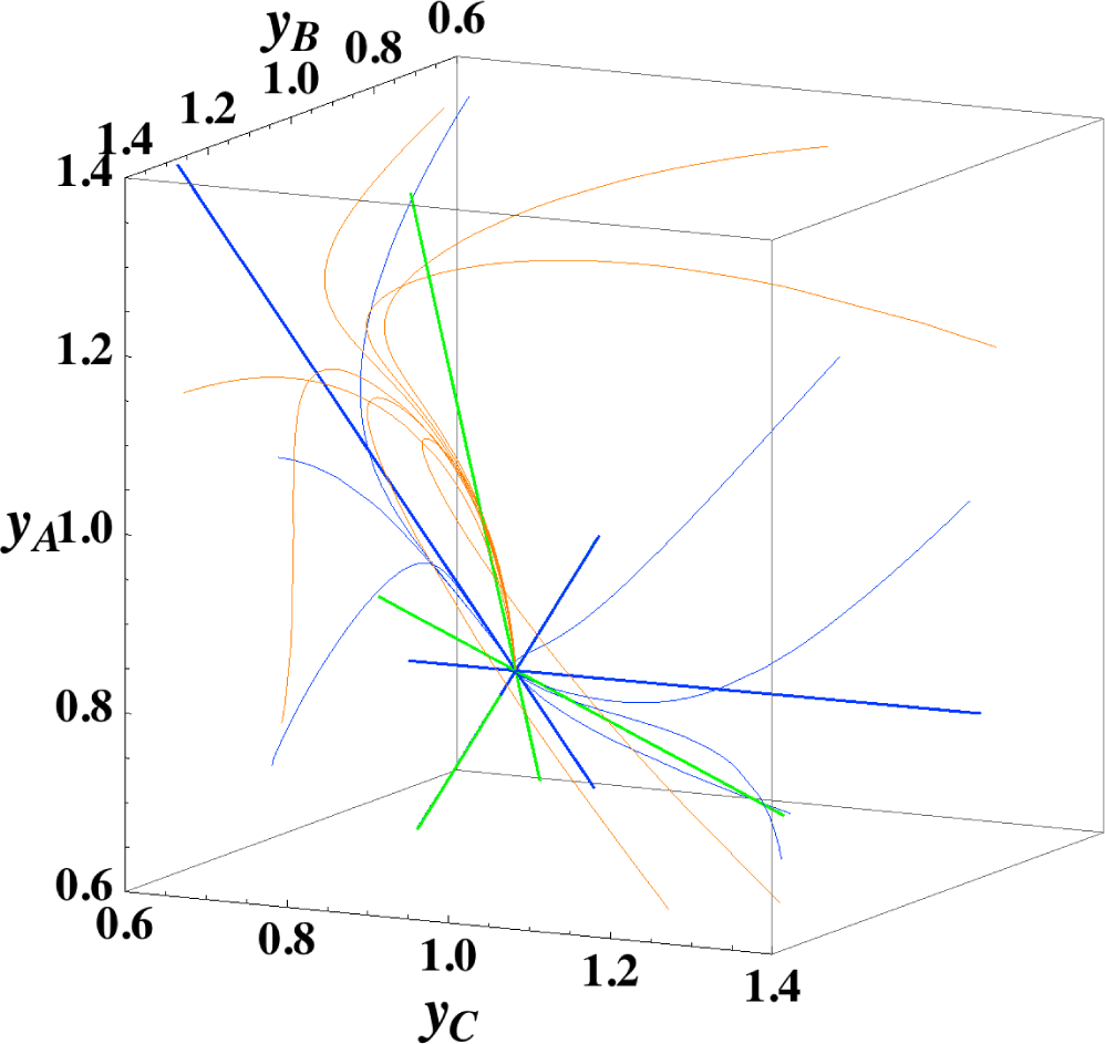 These calculations were performed with the fixed rate constants given in Table 1 for the same equilibrium composition but with different initial compositions (twelve in each figure [34]), and c = 3. The dimensionless equilibrium composition is (yA, yB, yC) = (1.223, 1.106, 1.223). Note that all paths reside in the so-called reaction simplex [35] (kinetics subspace or stoichiometric subspace, both of which coincide [10,36] for the present system) that is determined by c and the stoichiometric coefficients (or the so-called reaction vector [36]) of each reaction. The present reaction simplex is a 2-D plane in the 3-D concentration (yA, yB, yC) phase space. The Following Observations are made from Figures 1 and 2: