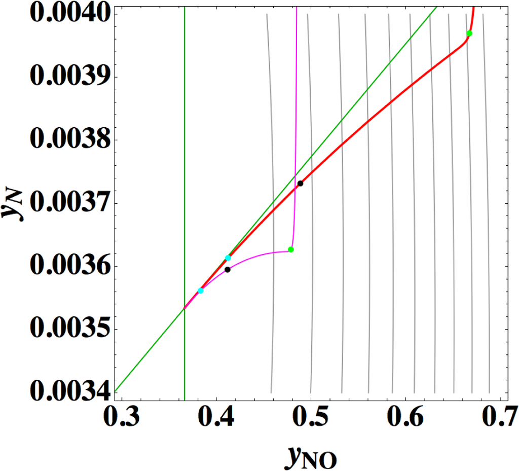where yNO, yN, yO, , and are concentrations of the species NO, N, O, O2, and N2, respectively. These constraints are the conservations of element oxygen, element nitrogen, and the total number of species in the system, respectively. The calculation is done with:
