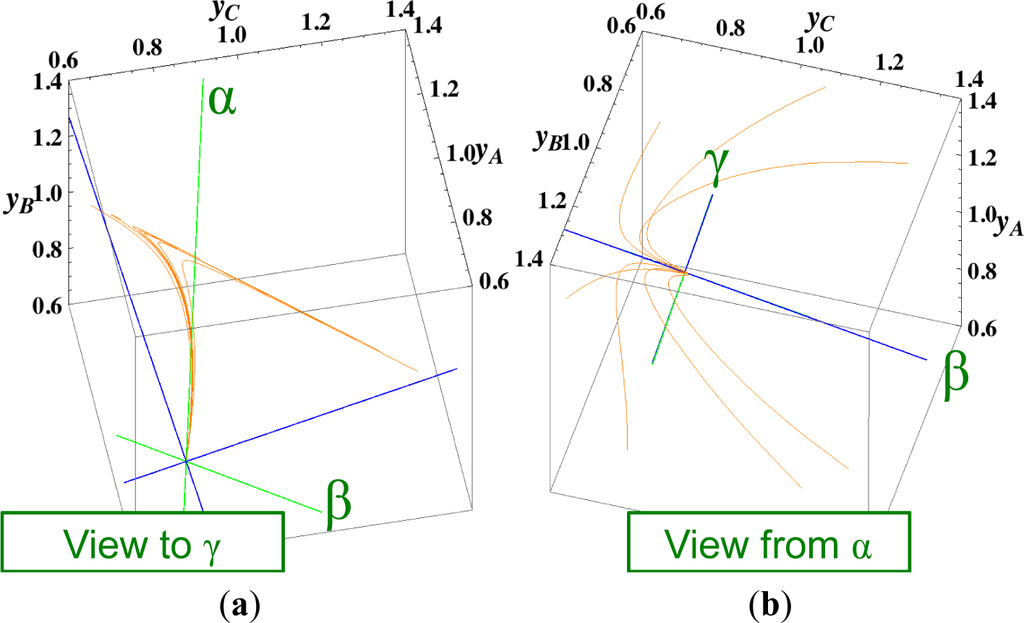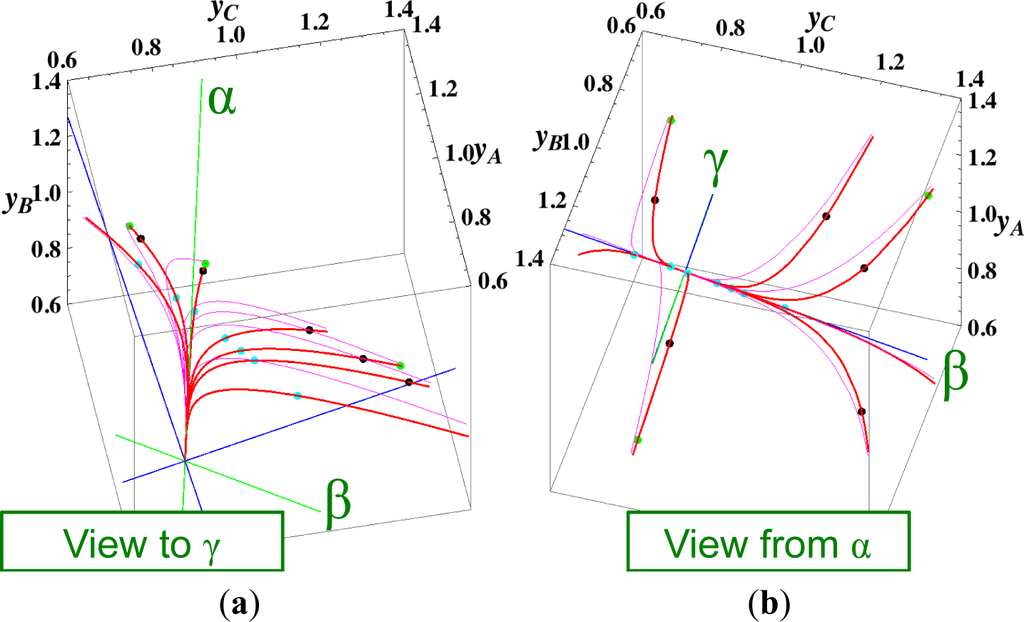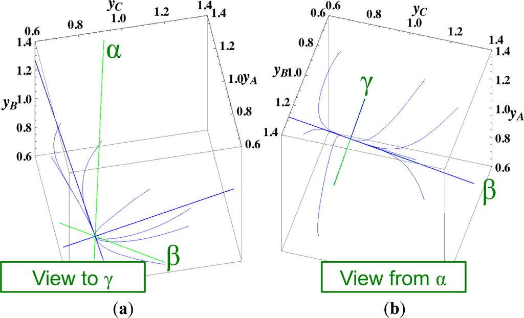 Figure 6. Steepest descent paths of the reactions A ⇆ B ⇆ C ⇆ D projected into the concentration (yA, yB, yC) phase space. All lines and the symbols have the same meanings as described in the captions of Figures 2 and 5. (a) A view of Figure 4 in the direction of the γ-eigenvector of the chemical kinetics Jacobian of Equation (4) (To the point “γ” from the equilibrium point); (b) A view of Figure 4 in the reverse direction of the α-eigenvector of the chemical kinetics Jacobian of Equation (4) (From the point “α” to the equilibrium point”).- (4)