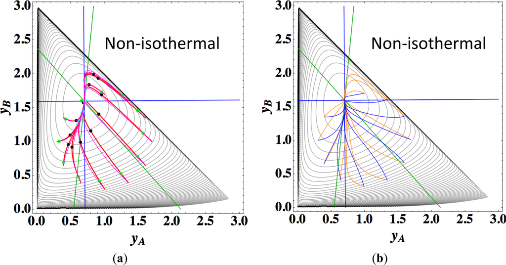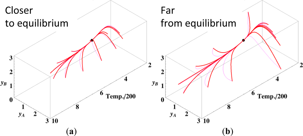 The paths of linear non-equilibrium (magenta lines in Figure 1) most closely resemble that of chemical kinetics. They have the same 1-D manifold as that of chemical kinetics (one of the eigenvectors of the Jacobian of Equation (4) at equilibrium) expected from the path coinciding with the chemical kinetics path to first order in each variable εl. (The two eigenvectors of the Jacobian of Equation (4) at equilibrium are (1, 0.1544) and (1, −2.928) in the coordinates (yA, yB). The former is the 1-D manifold.)