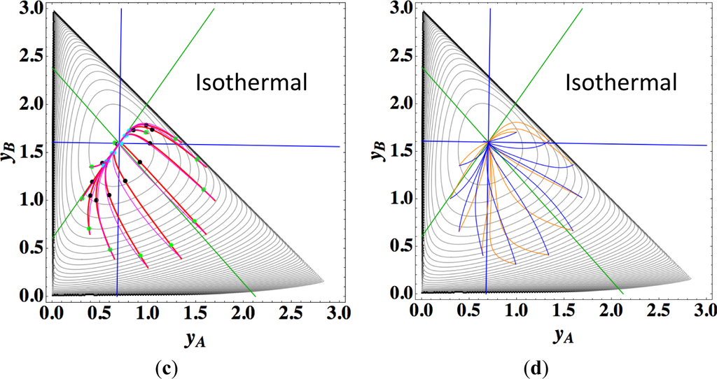 Figures 9a,b show the four paths (chemical kinetics, linear non-equilibrium, steepest descent, and Newton direction) projected onto the concentration (yA, yB) phase plane for the same calculation as for Figure 8a, together with the contour of σ at the final equilibrium temperature. Figures 9c,d also show the paths for the isothermal case, the temperature of which was set as the final equilibrium temperature of the non-isothermal case; therefore, the dimensionless equilibrium composition and temperature are the same as those of the non-isothermal case.