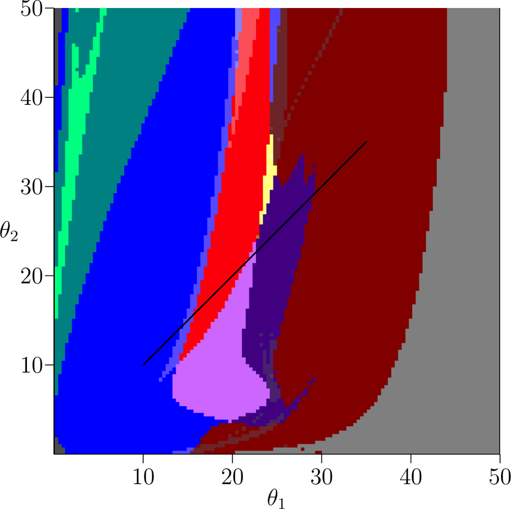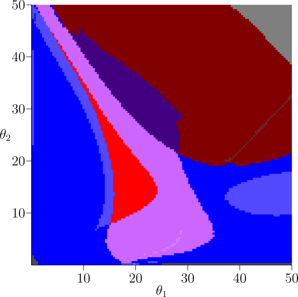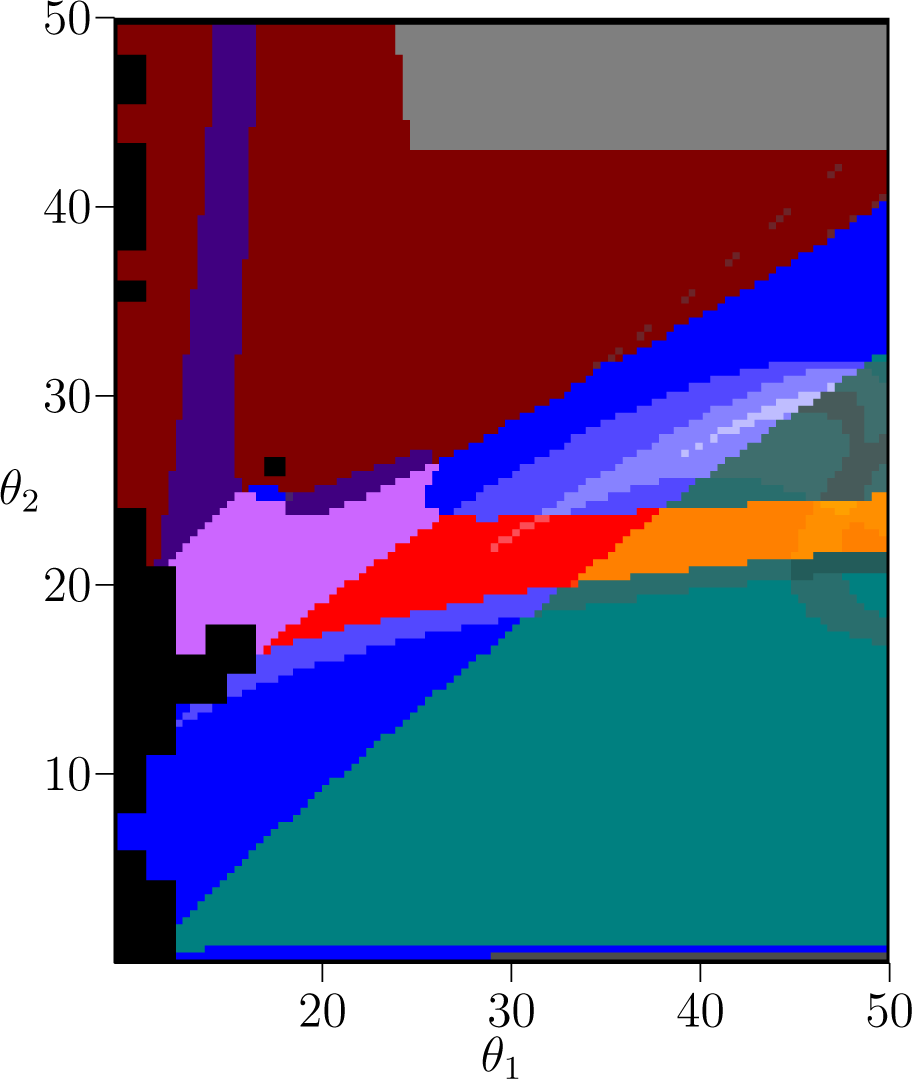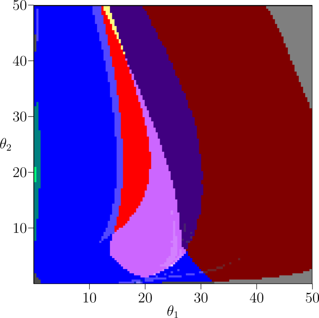 Having established interpretations for the individual Conley-Morse graphs, we now turn to how they are related. Figure 1 displays a picture of parameter space output by the database for the plant model s = 0. Each color region indicates a subset of phase space with the same Conley-Morse graph. We hasten to add that this image represents a simplification of the continuation classes defined in Section 3. In particular, in Figure 1 the classification is based on purely on the Conley-Morse graph, ignoring the clutching graph information. This simplification is done for visual clarity; to see the complete continuation classes the reader is urged to download the database files and software from [].