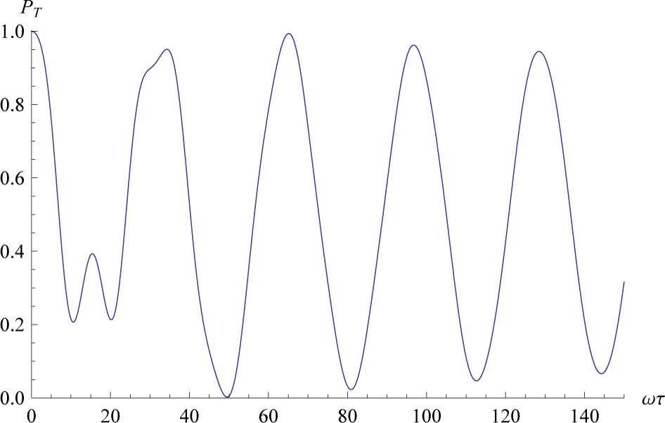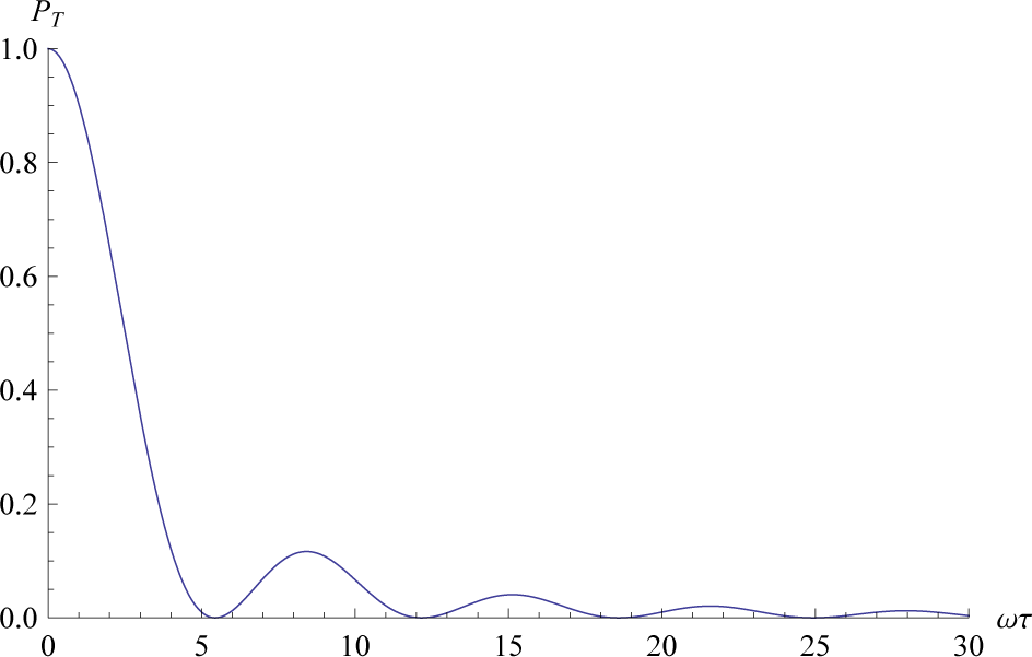The transition probability for finite τ, PT = | − â1|1 sin(ϕ) + â1|0 cos(ϕ)|2, is shown in Figure 5.