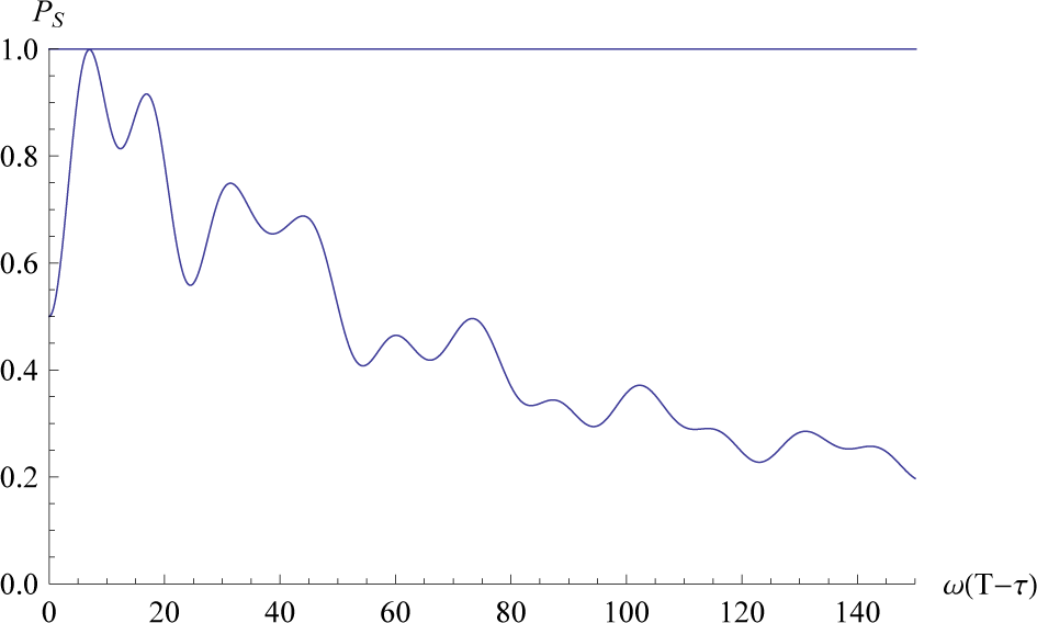 The survival probability in the restoration process is illustrated in Figure 2 where T − τ is the period of the restoration process. In the limit of the quasi-static process, T − τ → ∞, there is no transition to the excited state and the ground state is preserved. As is seen in Figure 2, there are shorter periods for a restoration that preserves the ground state (PS = 1). The shortest time for the restoration is realized by , where in Equation (12) for θ − θa = π/2 and η = ω(T − τ)/π.