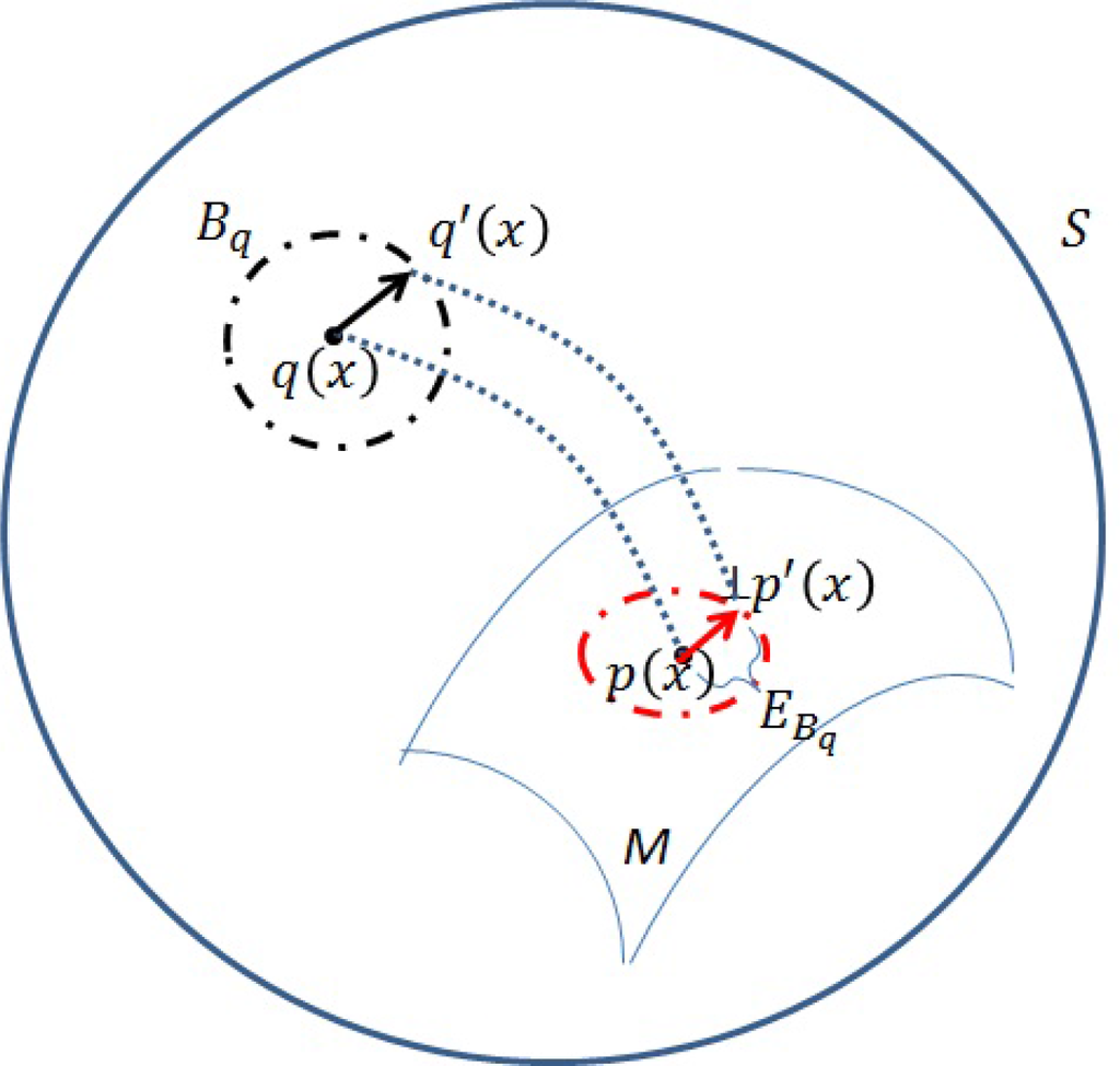 Let M be a smooth k-dimensionality submanifold in S (k < 2n − 1). Given the point q(x) ∈ S, the projection [8] of q(x) on M is the point p(x) that belongs to M and is closest to q(x) with respect to the Kullback–Leibler divergence (K-L divergence) [17] from the distribution q(x) to p(x). On the submanifold M, the projections of q(x) and q′ (x) are p(x) and p′(x), with coordinates ζp and ζp + Δζp, respectively, shown in Figure 2.