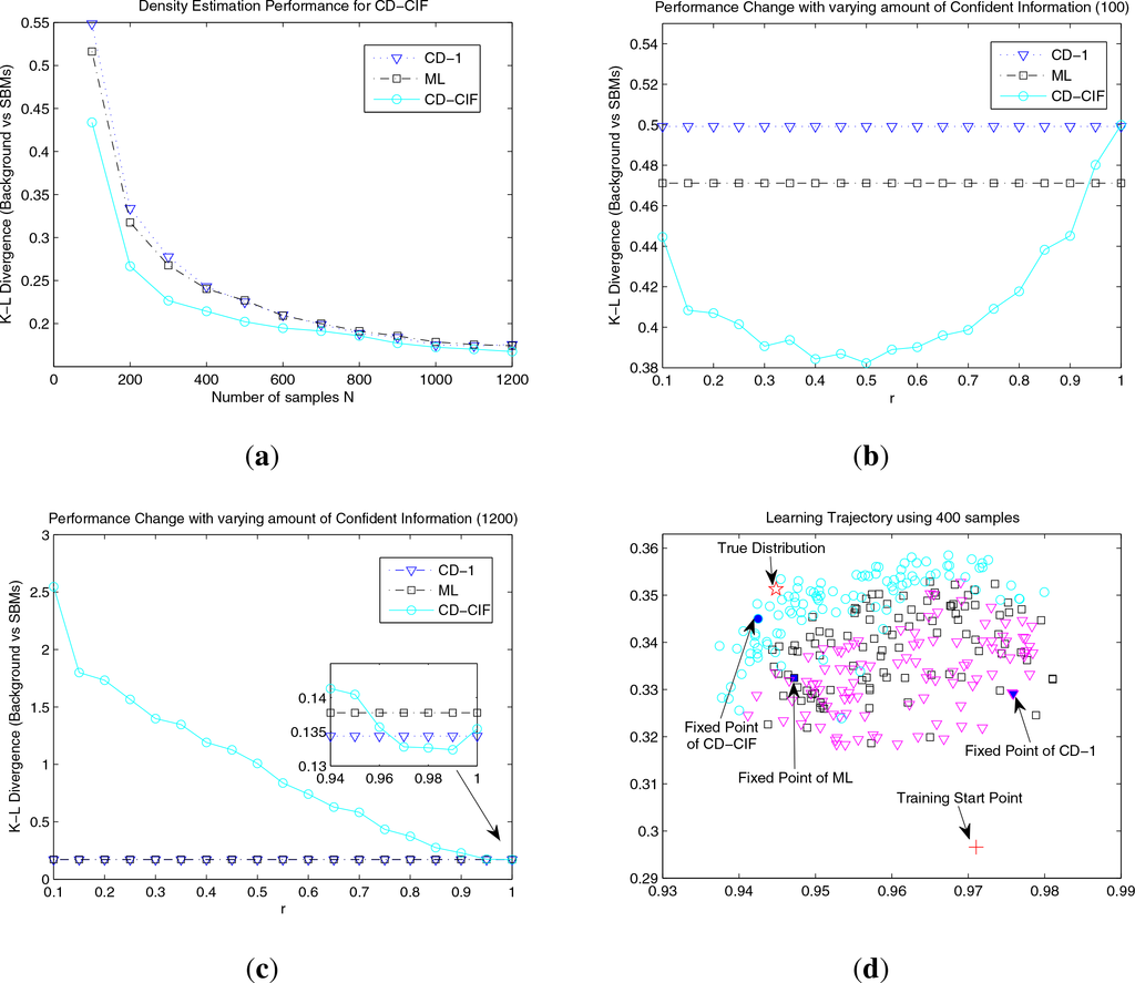 (a): the performance of CD-CIF on different sample sizes; (b) and (c): The performances of CD-CIF with various values of r on two typical sample sizes, i.e., 100 and 1200; (d) illustrates one learning trajectory of the last 100 steps for ML (squares), CD-1 (triangles) and CD-CIF (circles).