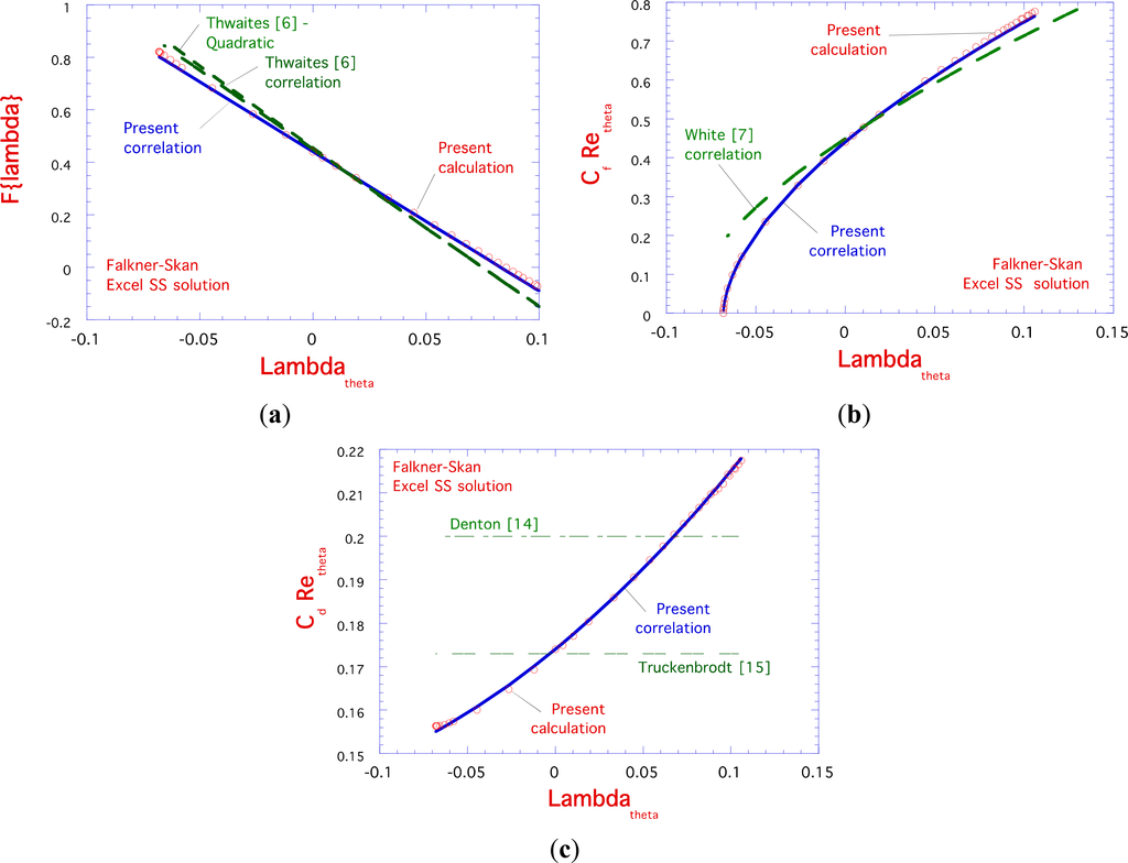 From our results, Figure 1 provides graphs of F{λθ} as well as Cf Reθ. The circles are the individual calculated values. These correlations (solid lines) are compared to the recommendations of Thwaites [6] and White [7] (dashed lines). For these Falkner-Skan flows our agreement is generally better. Thwaites discussed flows with a stagnation region, like an airfoil leading edge, in terms of the Falkner-Skan solution for U∞ = 0 (m = β = 1 → F{λ} = 0); however, our correlation for F{λ} meets his criteria better than his correlation does (see Figure 1a).