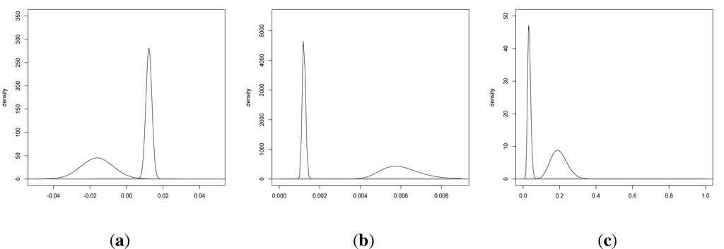 | Case | Regime 1 (μi, σi) | Regime 2 (μi,σi) | Regime 3 (μi, σi) | Transition Probability |