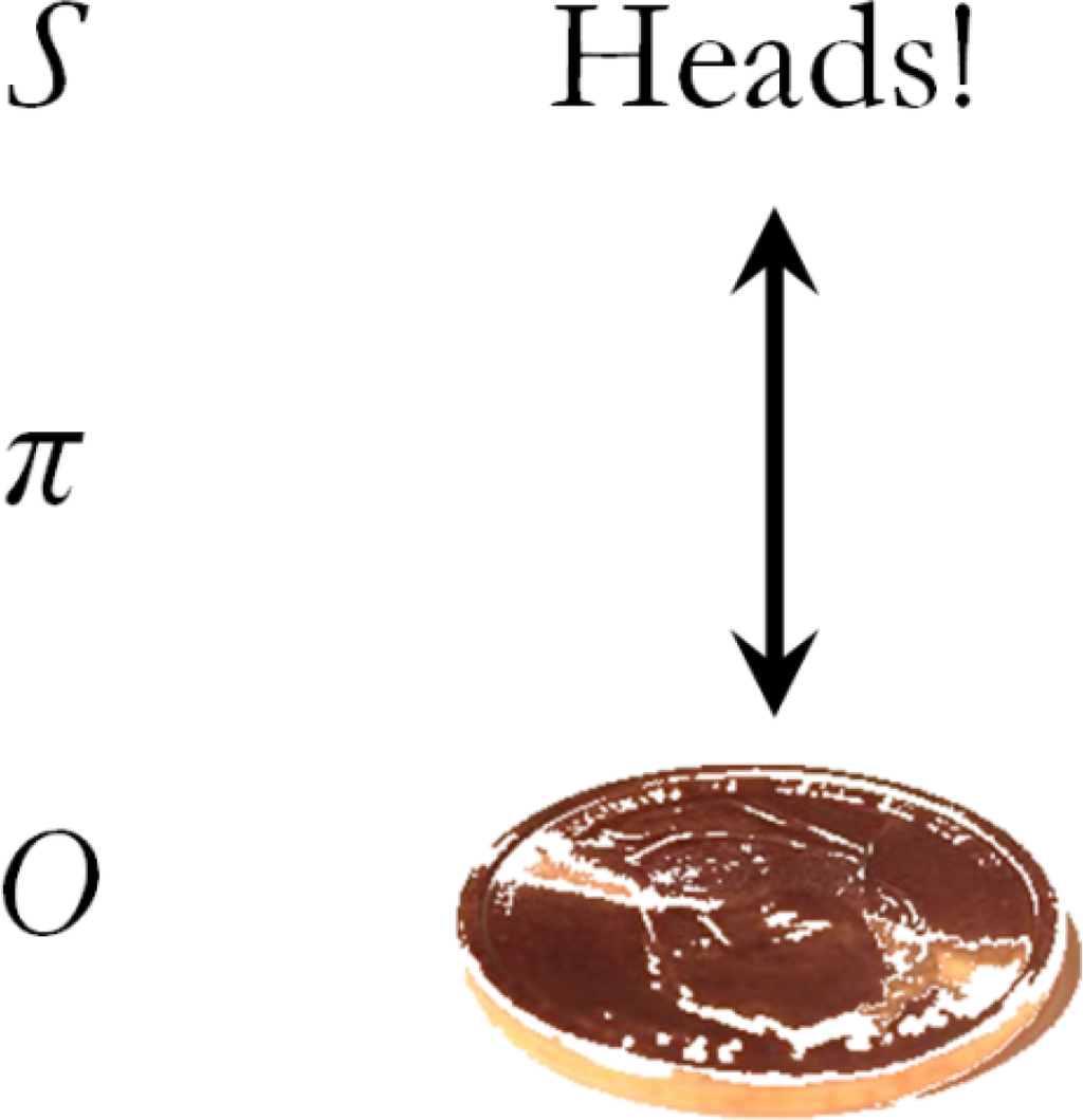The idea for this series on Biosemiotic Entropy began with a paper for an earlier special issue edited by Søren Brier [] that focused on “the antithesis of entropy” []. Later, the positive term pragmatic information [], the gold-standard of linguistic content (i.e., meaning in its most concrete and ordinary sense) which is the kind found in true narrative representations (TNRs) [–], was proposed. A TNR is simply a faithful report of a sequence of actual events experienced by one or more competent observers. Examples in the sciences would include all valid reports of experiments that are interpretable and replicable, precisely up to the level of their interpretability and replicability. An intriguingly relevant and complex experimental report presumably qualifying as a TNR is the widely read, much cited, and celebrated production of a Bose-Einstein condensate of rubidium atoms by Eric Cornell and colleagues in 1995 [,]. In ordinary experience, to use a simpler and extremely familiar example, reducing the elements of a TNR to the critical formal elements that all of them must possess, suppose that a coin toss results in the coin landing with the HEADS side up—where the capital letters merely suggest reference to the HEADS side of the physical coin itself rather than whatever words might be used to report the physical outcome of the coin toss. If the person judging the toss reports, “Heads!” when the coin lands, and, in fact, the coin has landed with its HEADS side up rather than its TAILS side up, the representation is a TNR. For all possible TNRs, whether as complex as the report of the achievement of the Bose-Einstein condensation by Cornell and colleagues, or as simple as the truthful report of the result of a coin toss (Figure 1), on a purely formal basis must involve a coherent fit between a string of symbols, S (broadly construed as one or more words in one or more languages, a text of any length, a sequence of pictures, diagrams, or any meaningful string whatsoever in any language or language-like system of representations), an intelligible pragmatic (actual) mapping relation, π, that connects the string, S, systematically to its actual fact(s) set in a sequence of real events designated as the object, O, of the TNR. Let the string, SπO represent the formal relations underlying every such TNR as shown in Figure 1.