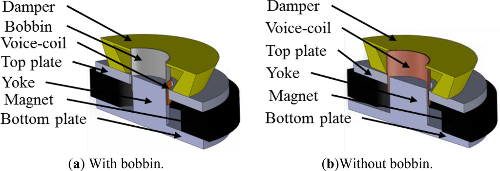 A 200-W woofer with an 8-inch diaphragm consisting of a damper, bobbin, voice coil, top plate, yoke, magnet and bottom plate was investigated, as shown in Figure 1 [10]. The damper located over the voice coil could support the vertical motion of the voice coil and diaphragm. The bobbin was made of polyimide, which has heat-resistant properties. Like the human voice, the goal of the voice coil is to generate sound when input power is supplied to form a magnetic field. The voice coil was made of copper wound around the bobbin. Both the top and bottom plates were made of pure iron and were used for the magnetic field flow control and the magnetic field strength enhancement generated by the permanent magnet. The permanent magnets used in woofers are generally divided into ferrite, alnico and rare earth elements. The permanent magnet used in this study was of the ferrite type. The magnet generates a magnetic field to interact with the magnetic field generated by the voice coil.