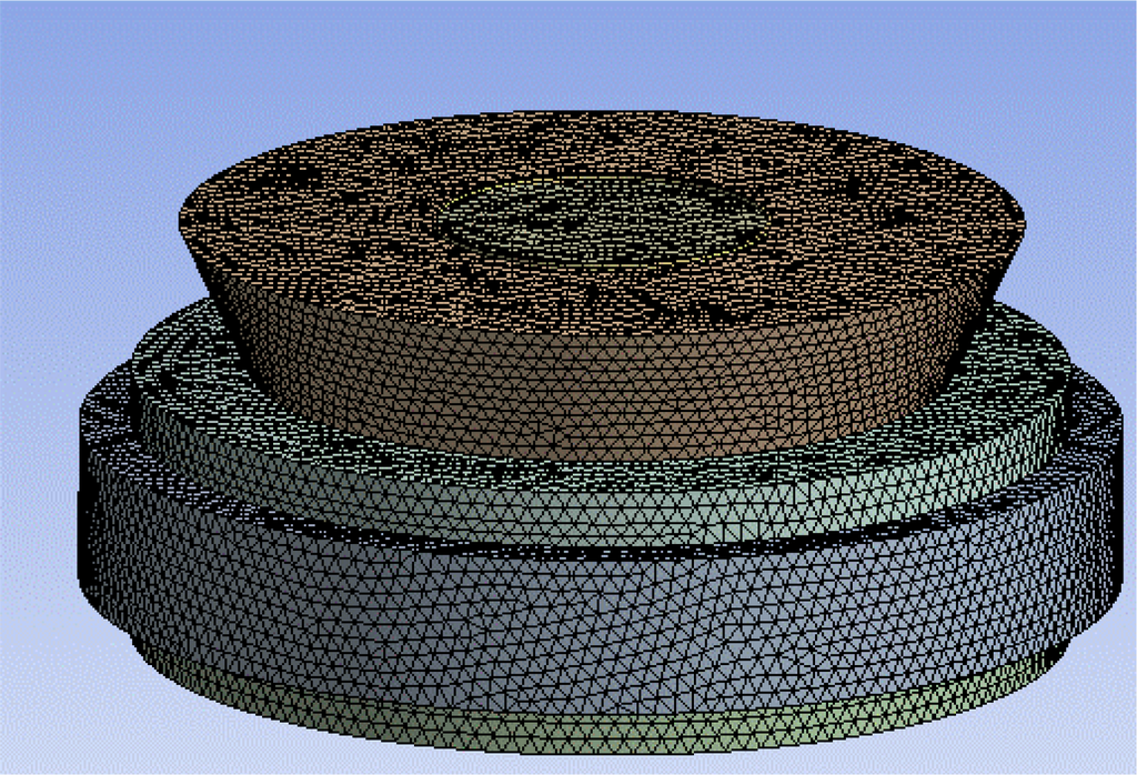 Figure 2 shows the configurations of the 3D modeling for the woofers with and without the bobbin. In order to analyze the effect of the bobbin, woofers with and without a bobbin were considered, as shown in Figure 2a,b respectively [12]. The heat transfer analysis was numerically performed using commercial numerical analysis software (ANSYS CFX, FLUID FLOW Tool) [13]. The mesh map of the tested physical model was made using tetrahedron elements with a maximum size of 2.0 mm and minimum size of 0.01 mm, comprising 406,210 elements and 74,372 nodes. Figure 3 shows the mesh map of the physical model. The heat transfer of the woofer was analyzed using the k-ε model [14]. Table 2 shows the numerical conditions used in the simulation. The temperature and pressure of the air inside the woofer system were set to 25 °C and 101.3 kPa. The gravitational force was 9.8 m/s2. Additionally, the nominal impedance of the woofer was 8.0 Ω. In order to calculate the voice coil temperature, the input power supplied to the voice coil of the woofer was varied from 5 W, 15 W, 30 W, 45 W to 60 W. The working fluid was air. Table 3 shows the thermodynamic properties of the main components for the woofer. The thermal conductivities of the pure iron, copper, permanent magnet and air were 60.5, 401, 50 and 2.61 × 10−2 Wm−1 K−1, respectively. The specific heat capacities of the pure iron, copper, permanent magnet and air were 4.34 × 102, 3.85 × 102, 4.0 × 102 and 1.0044 × 103 J kg−1 K−1, respectively.