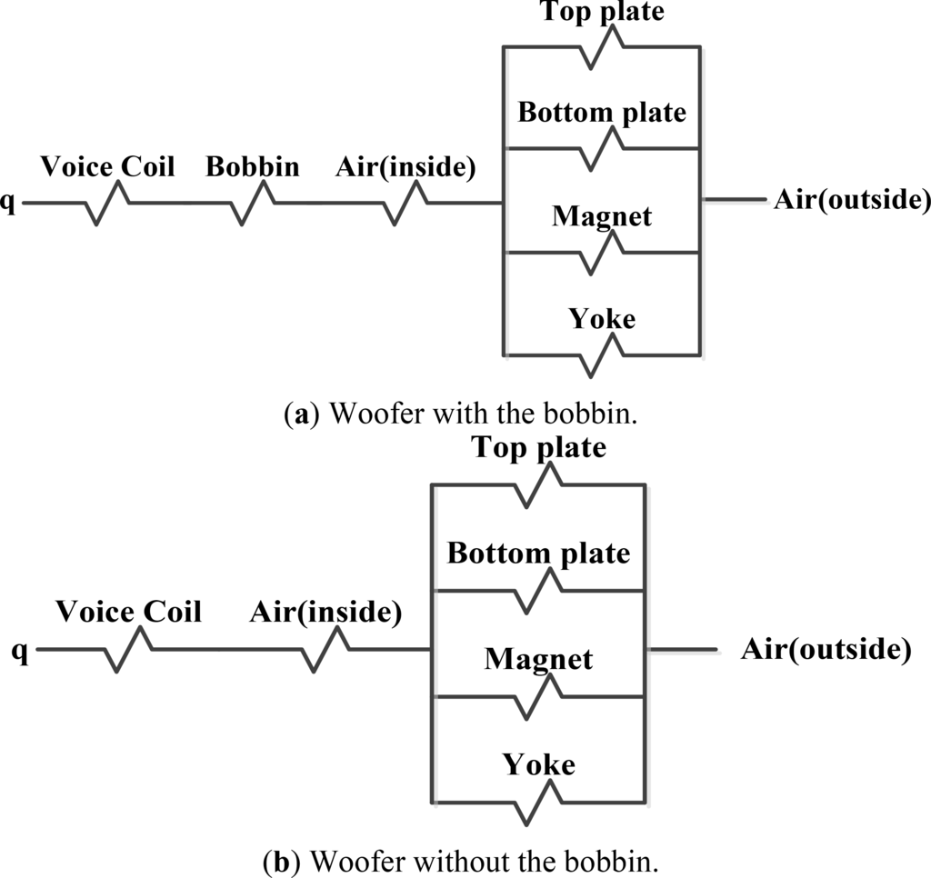 Heat transfer models using the thermal equivalent circuit technique for the tested woofers.