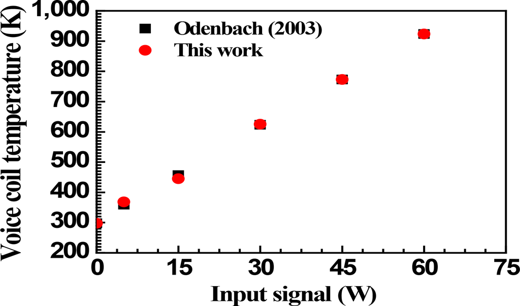 Figure 6 shows the voice coil temperature of the tested woofer with the bobbin in comparison with the results by Odenbach (2003) [17]. Both results were compared with input powers ranging from 5 W to 60 W. The numerical results show good agreement within ±1% of the data by Odenbach (2003) [17]. In addition, the voice coil temperature of the woofer increased linearly with the input powers. The voice coil temperature could be theoretically calculated using Equation (1). The temperature increase of the voice coil could be calculated by the resistance increase with the rising of the input power, as mentioned in Ciprian (2005) [18].