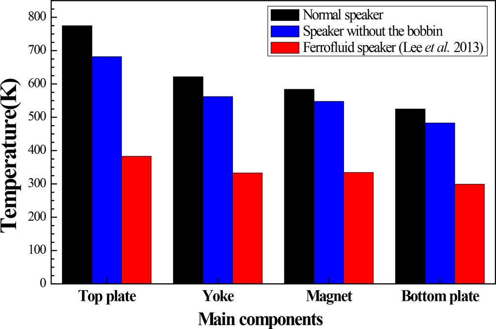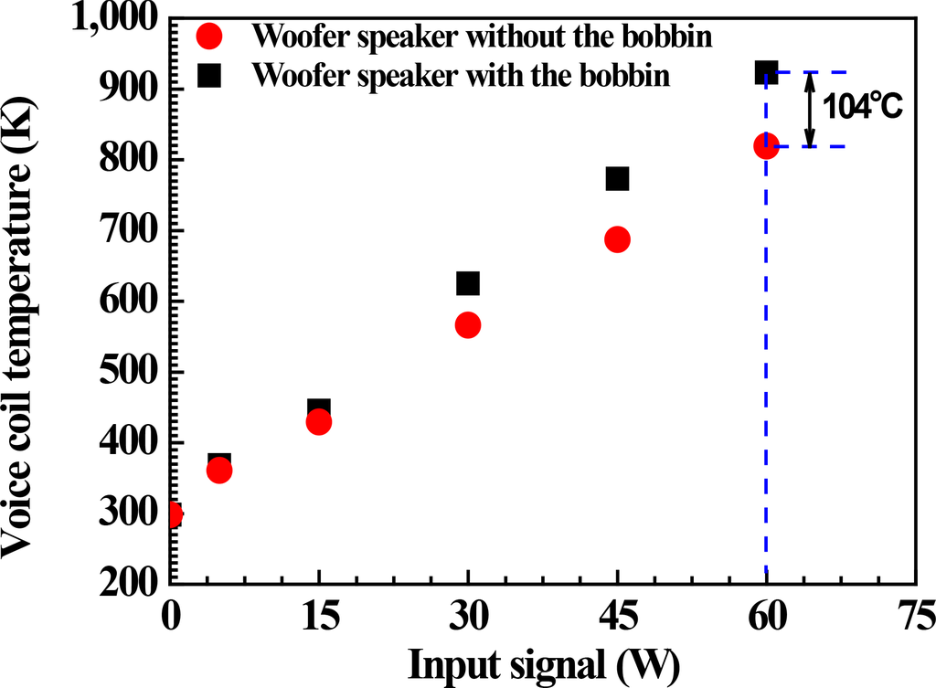 However, precise and concise studies on the temperature of heat transfer characteristics and on improvements for the performance of the woofer have been limited. Therefore, the objective of this study is to numerically investigate the characteristics and enhancement of the heat transfer of the voice coil for a woofer with and without bobbins using the thermal equivalent heat conduction models. In addition, due to the critical limitation of the maximum power of the woofers with the ohmic heat generated by the voice coils, the temperature characteristics of the voice coil for the tested woofer with and without a bobbin were observed while varying the input power.