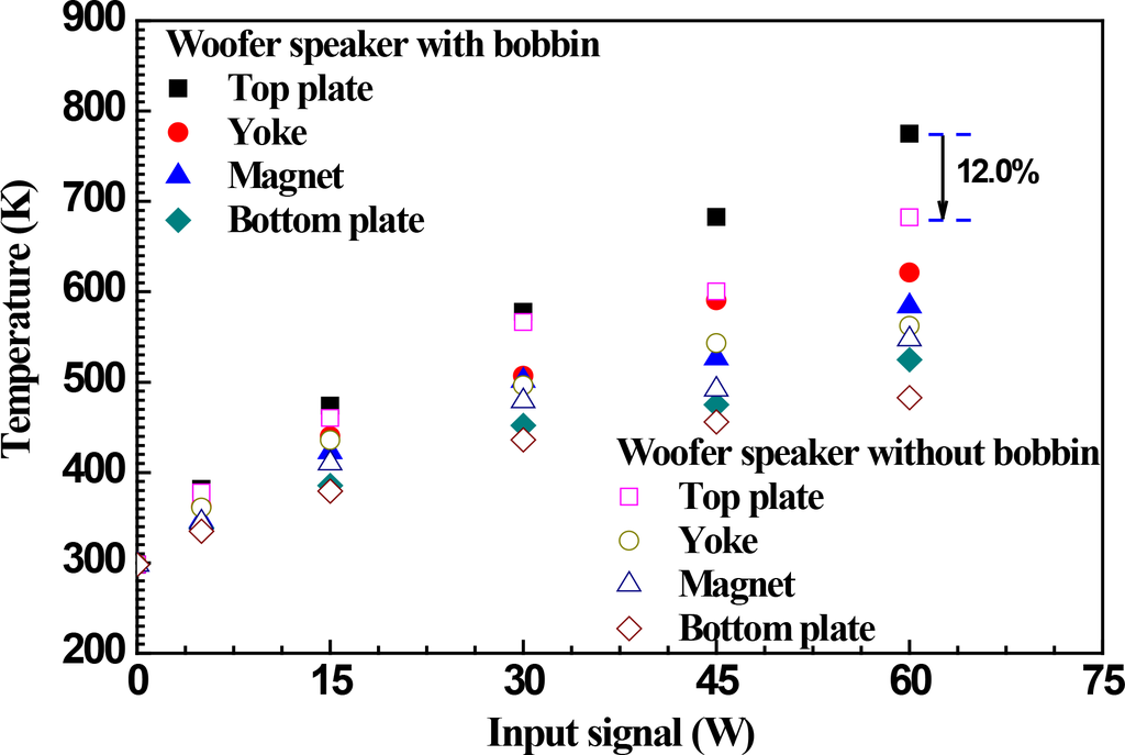 Heat transfer characteristics for the main components of the woofers with and without the bobbin varying with the input power ranging from 5 W to 60 W.