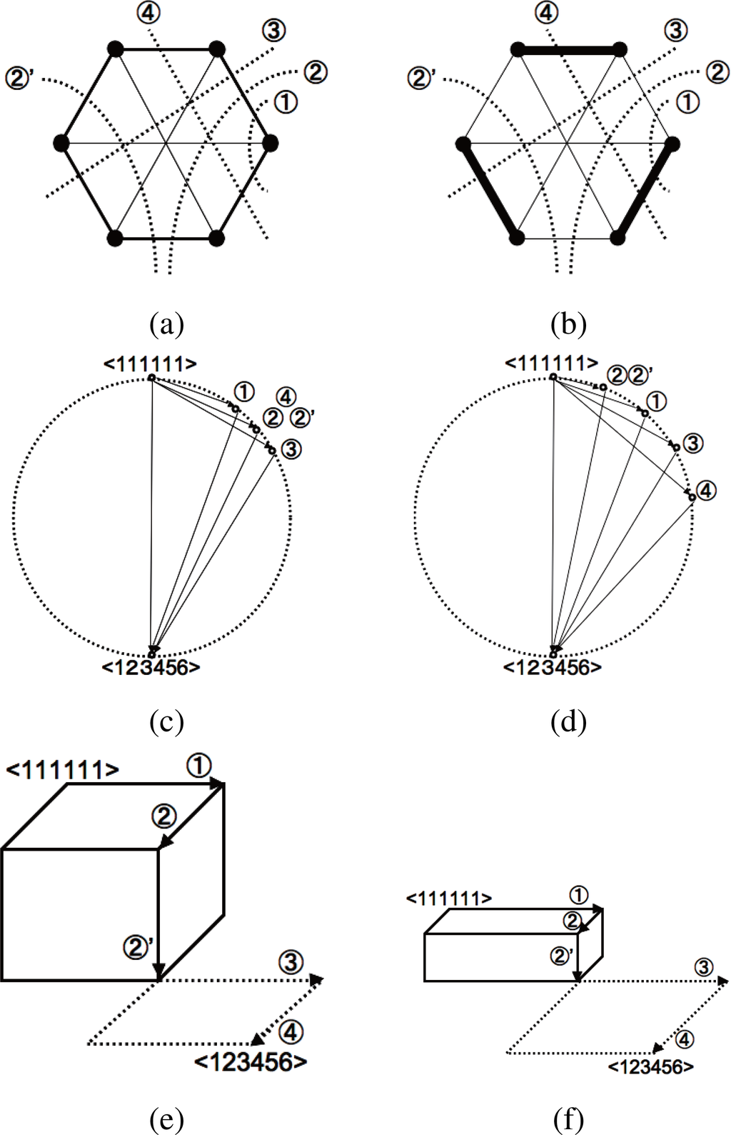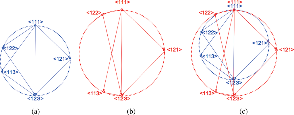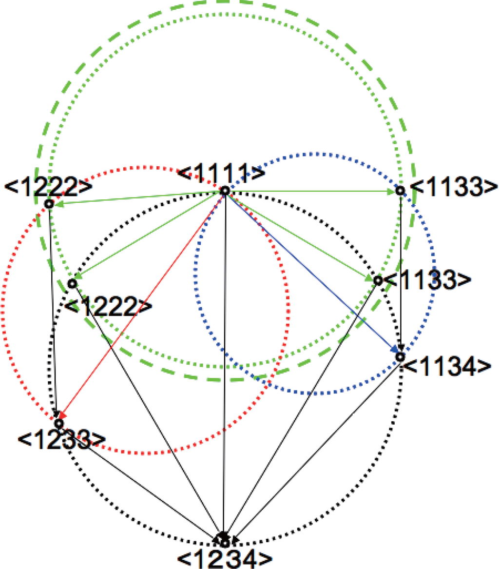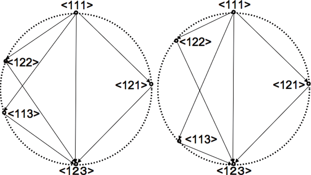 Figure 1 represents two different cases with the same I value in case n = 3. The distance between two systems in the same diagram corresponds to the square root value of KL-divergence between them. Clearly the left and right figures represent different dependencies between nodes, although they both have the same I value. Such geometrical variation is possible by the abundance of degree of freedom in dual coordinates compared to the given constraint. There exist 7 degrees of freedom in η or θ coordinates for n = 3, while the only constraint is the invariance of I value, which only reduce 1 degree of freedom. The remaining 6 degrees of freedom can then be deployed to produce geometrical variation in the circle diagram. As for considering system decomposition, the left figure is difficult to obtain decomposed systems without losing much information. While in the right figure there exists relatively easy decomposition < 122 >, which loses less information than any decomposition in the left figure. We call such degree of facility of decomposition with respect to the losing information as system decompositionability. In this sense, the left system is more complex although the 2 systems both have the same I value. Especially, in case D[< 111 >:< 122 >] = D[< 111 >:< 113 >] = D[< 111 >:< 121 >], the system does not have any easiest way of decomposition, and any isolation of a node loses significant amount of information.