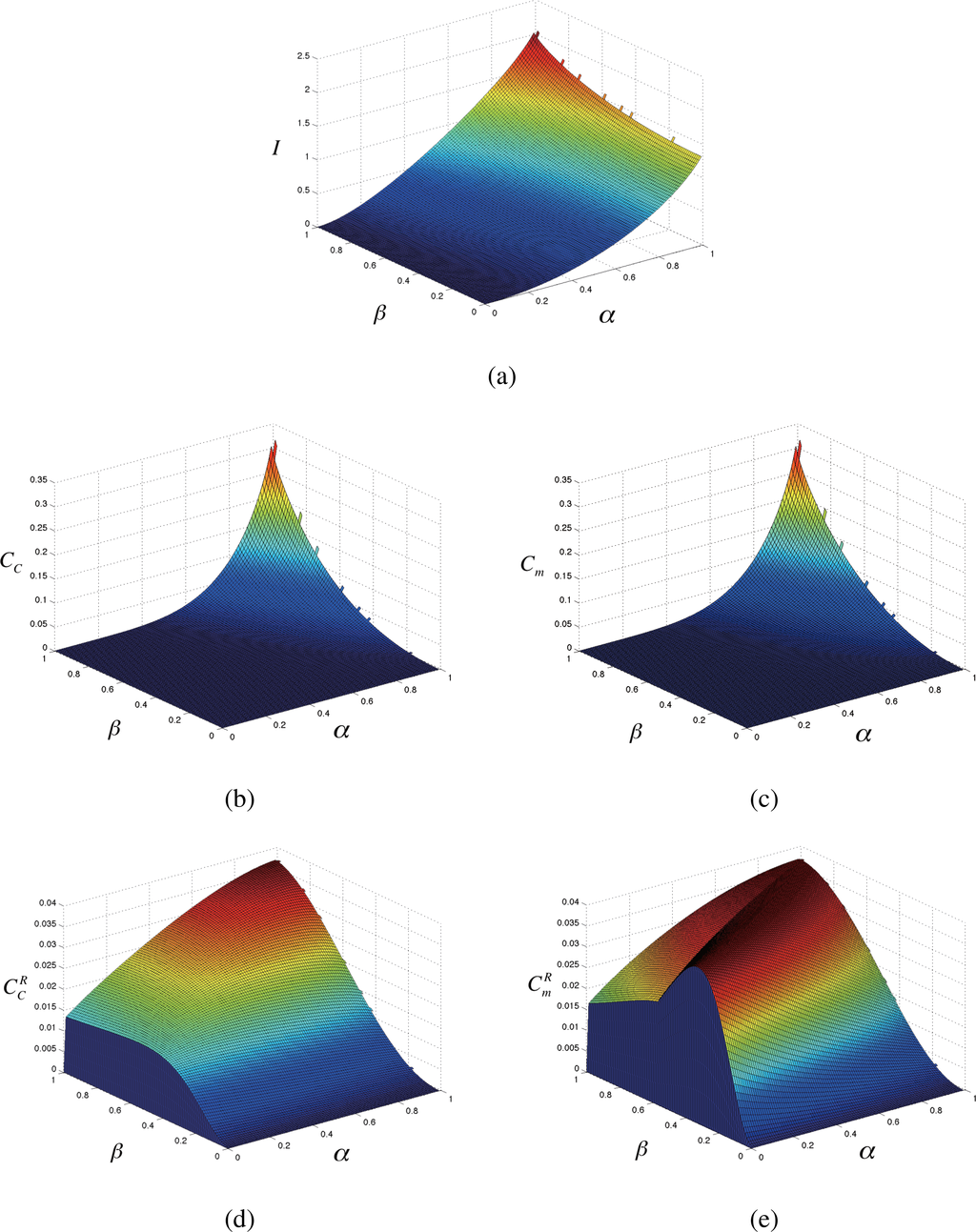 In contrast to arithmetic mean of information over the whole system, geometric mean has not been investigated sufficiently in the analysis of complex network. However in different fields, theoretical ecology has already pointed out the importance of geometric mean when considering the long-term fitness of a species population in a randomly varying environment [35,36]. Long-term fitness refers to the ecological complexity of its survival strategy under large stochastic fluctuation. Here, we can find useful analogy between the growth rate of a population in ecology and the spatio-temporal propagation rate of information between subsystems in general. If we take an arbitrary subsystem and consider the amount of information it can exchange with all other subsystems, the proposed complexity measures with geometric mean reflect the minimum amount with amongst all possible other subsystems, which can not be distinguished with arithmetic mean. The propagation rate of a population in ecology and the information transmission in complex network hold mathematically analogous structure. In population ecology, the variance of growth rate is crucial to evaluate the long-term survival of the population. Even if the arithmetic mean of growth rate is high, large variance will lead to low geometric mean even with a small amount of exceptionally small fitness situation, which ecologically means extinction of an entire species. In stochastic network, the variance of system decompositionability is essential to evaluate the amount of information shared between subsystems, or information persistence in the entire network. Even the multi-information I is high, large heterogeneity of edge information can lead to informational isolation of certain subsystem, which means extinction of its information. If such subsystem is situated on the transmission pathway, information cannot propagate across these nodes. Therefore, the proposed complexity measures CC,