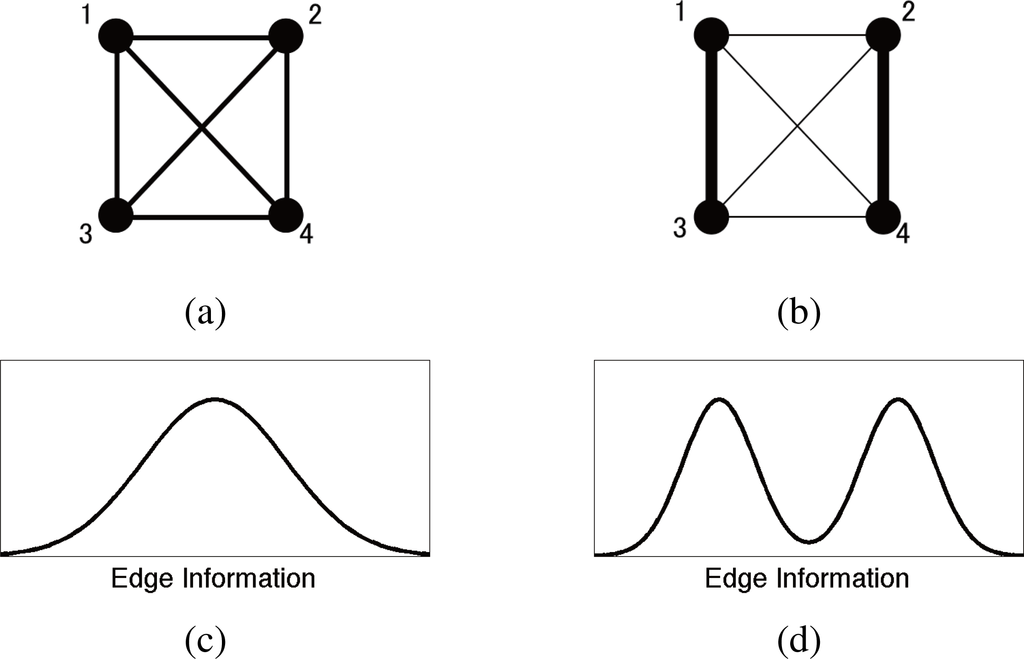 Schematic examples of stochastic systems with identical multi-information I where complexity measures with arithmetic mean fail to distinguish. (a): Example 1 of stochastic system with homogeneous mean of edge information and symmetric fluctuation of its heterogeneity; (b): Example 2 of heterogeneous stochastic system with bimodal edge information distribution and identical multi-information I and complexity based on arithmetic mean as example 1; (c): schematic representation of the distribution of statistical association (edge information) in upper network; (d): schematic representation of the distribution of statistical association (edge information) in upper network.