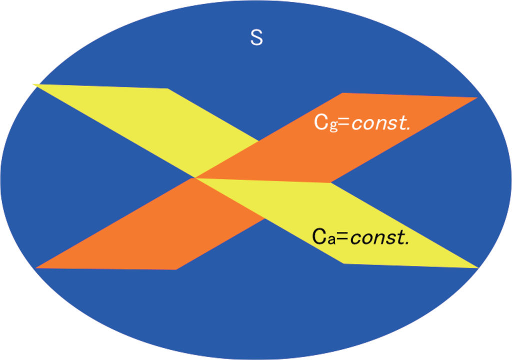 Schematic representation of complementarity between complexity measures based on arithmetic mean (Ca) and geometric mean (Cg) of informational distance. An example of the n − 1 dimensional constant-complexity submanifolds with respect to Ca = const. and Cg = const. conditions are depicted with yellow and orange surface, respectively. The dimension of the whole statistical manifold S is the parameter number n.