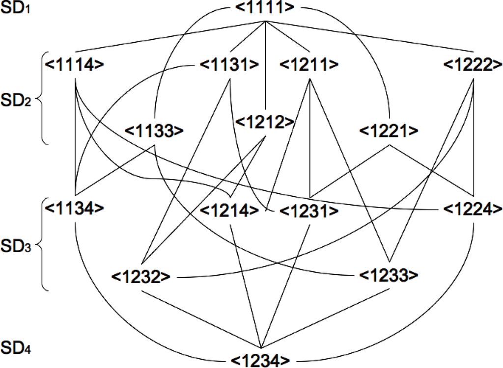 Figure 4 shows the hierarchy of the system decompositions in case n = 4. Such hierarchical structure between system decompositions is not homogeneous with respect to the subsystems number, and depends on the isomorphic types of decomposed systems. This fact produces certain difference of meaning in complexity between each KL-divergences when considering the system decompositionability.