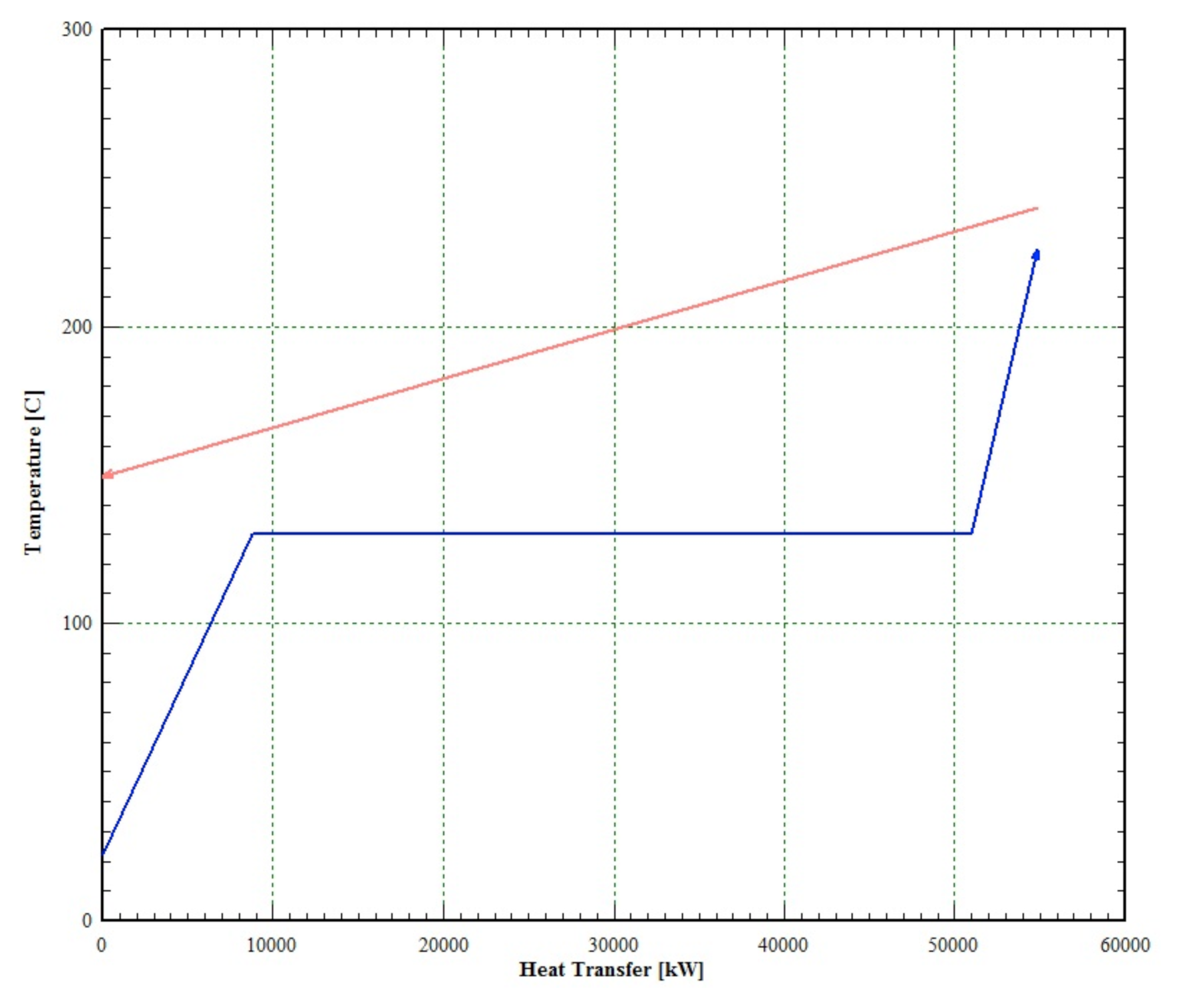 For SF2, 3, the HTF operates in the range: 240 and 150 °C. At the SF2, 3 pressure, water saturates at 130.42 °C, where most part of the heat exchange will take place.