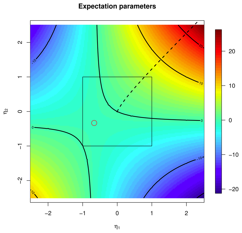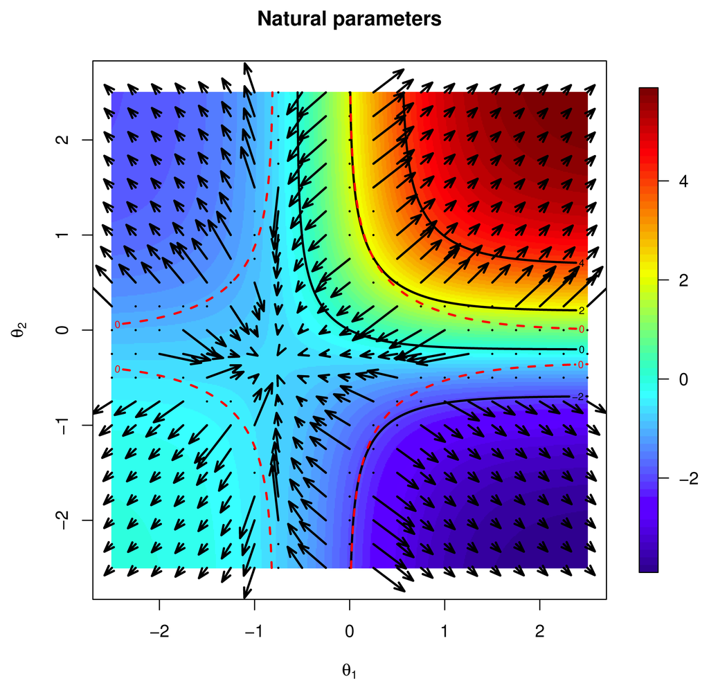 The gradient of Equation (2) has components ∂1F = a1 + a12η2, ∂2F = a2 + a12η1, and the flow along the gradient produces increasing values for F; however, the gradient flow does not converge to the maximum of F; see the dotted line in Figure 2. However, one can follow the suggestion by [15] and use a modified gradient (the “natural” gradient) flow that produces better results in our problem; see Figure 3. Full details on this example are given in Section 2.5.2.