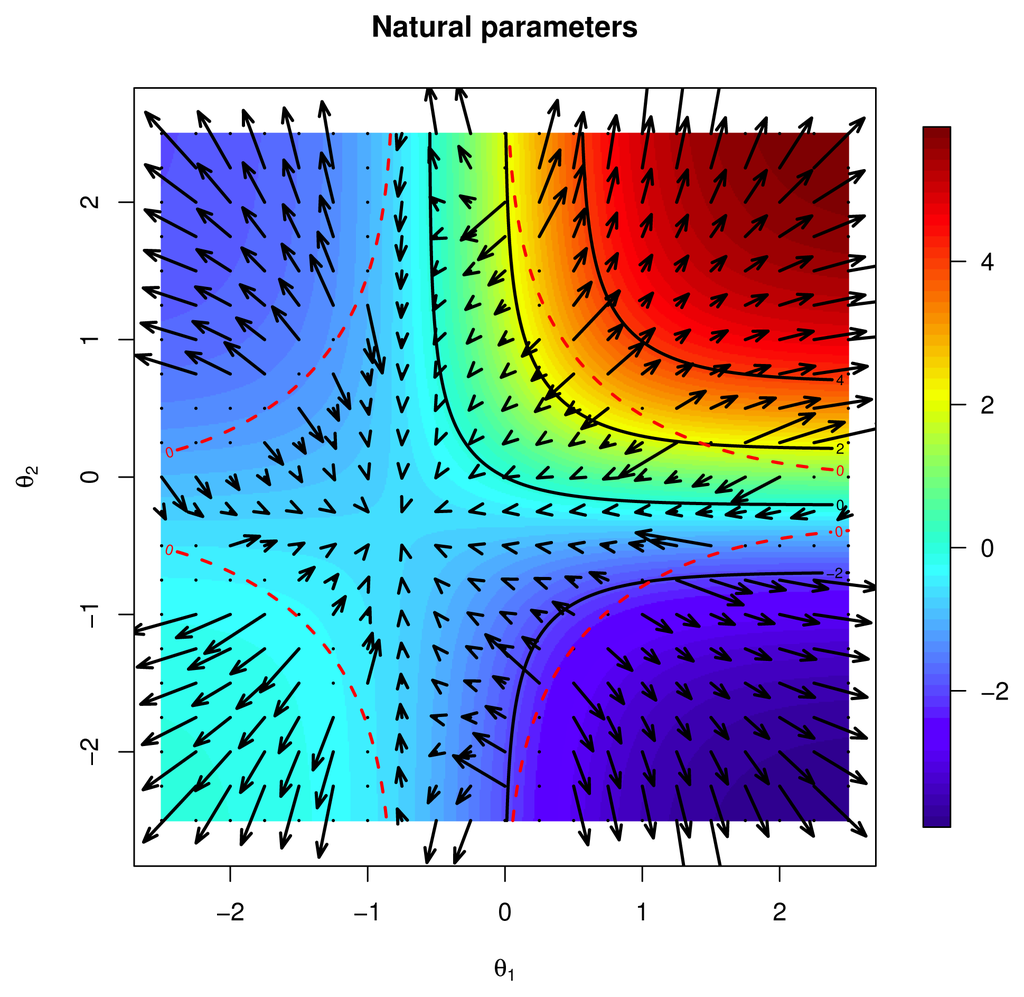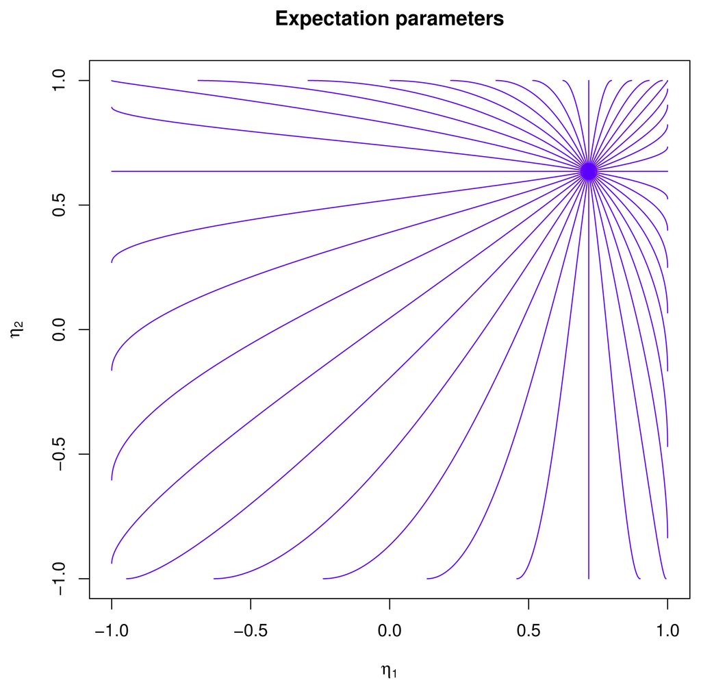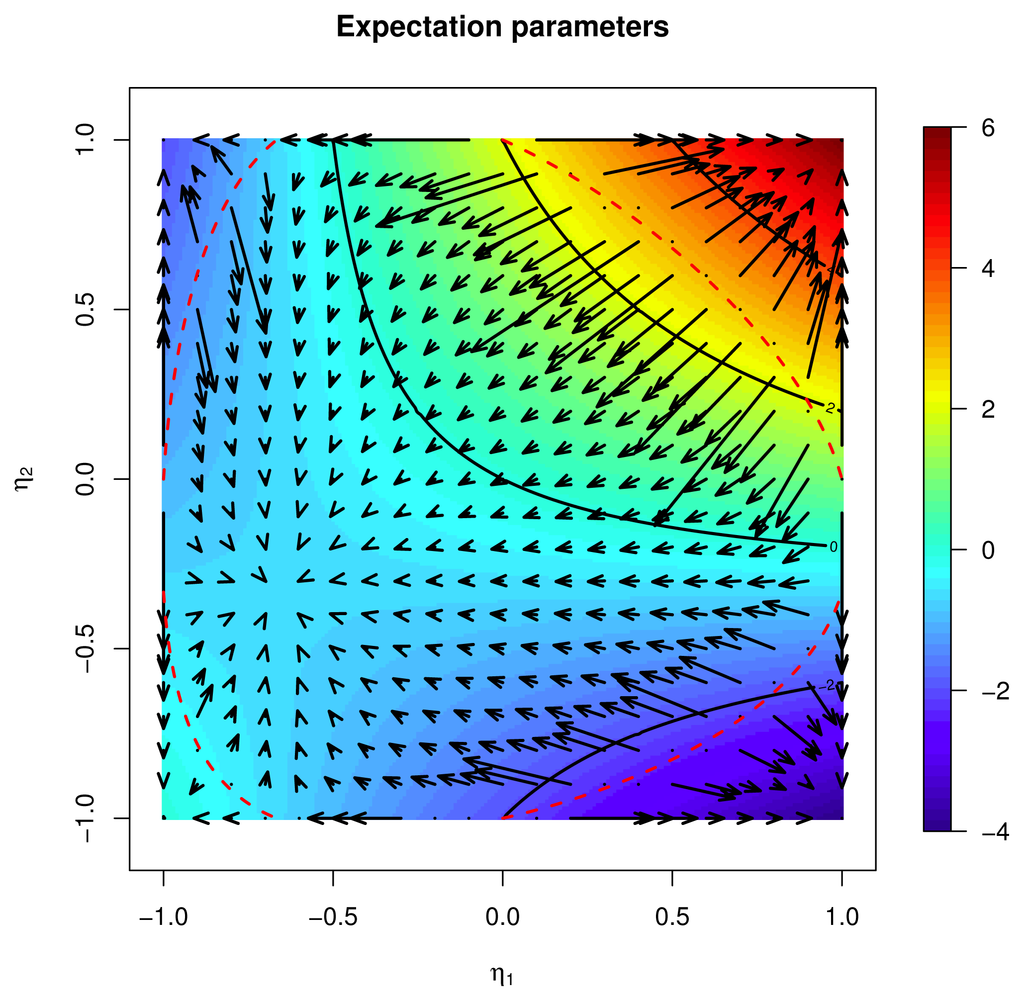 In Figure 6, we represented the vector field associated with the Newton step in the η parameters, with λ = 0.05, using the Riemannian retraction, for the case a1 = 1, a2 = 2 and a12 = 3, with: