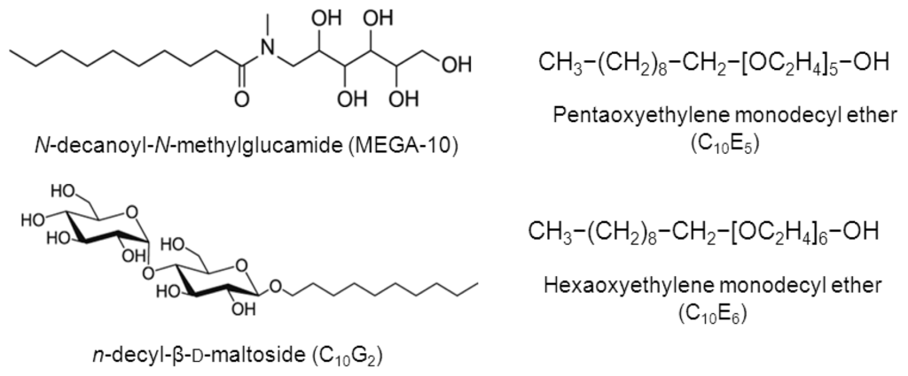 In the present work, we have studied the phase behavior of several binary mixtures of ethoxylated and sugar surfactants, in the presence and absence of NaCl. Figure 1 shows the molecular structures of the surfactants studied. As can be seen, all of them have the same ten carbon hydrophobic chain length but their headgroups are chemically and structurally different. A flexible, and polymer-like headgroup characterizes the ethoxylated surfactants (C10E5 and C10E6), whereas the sugar surfactants are mainly characterized by their numerous hydroxyl groups in the hydrophilic moiety.