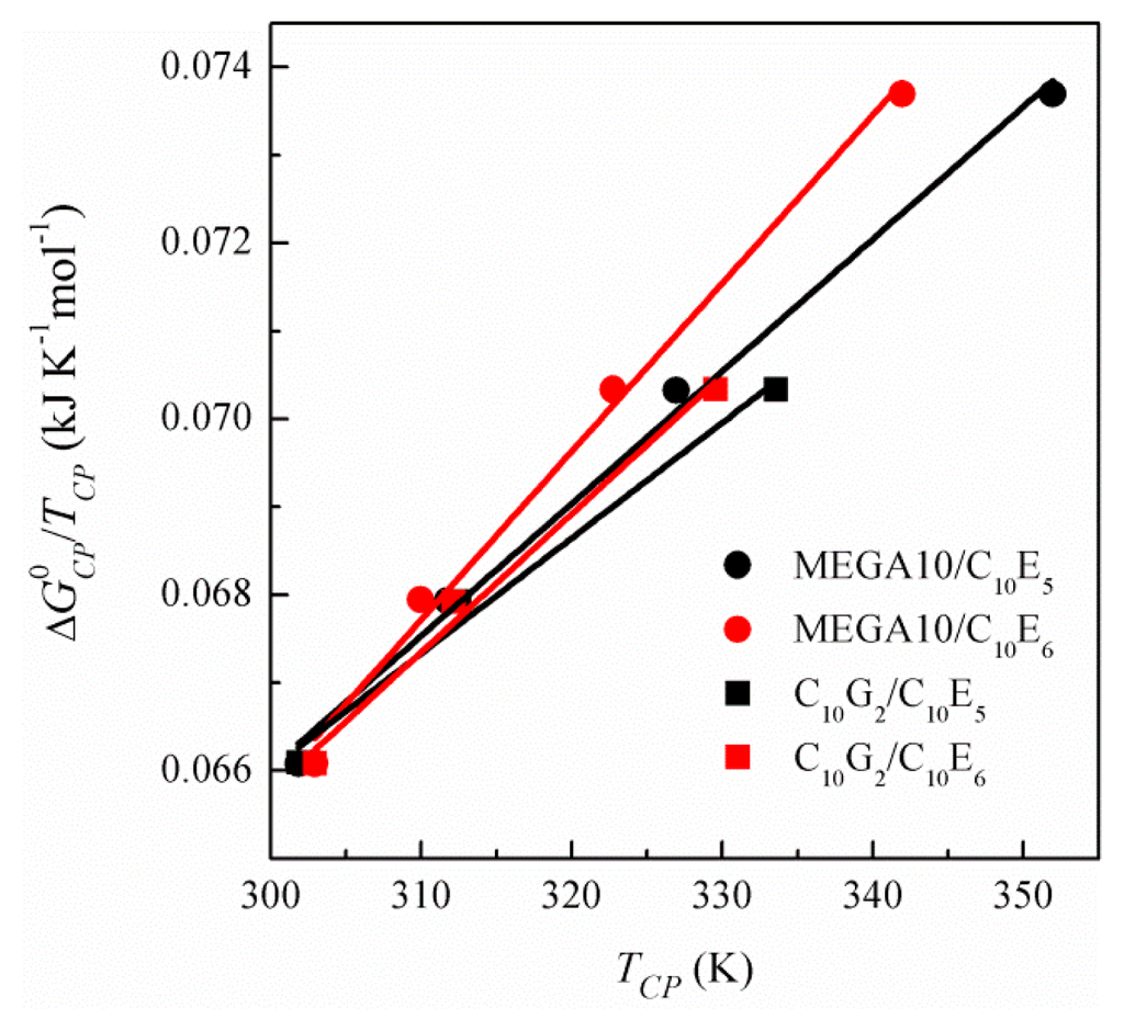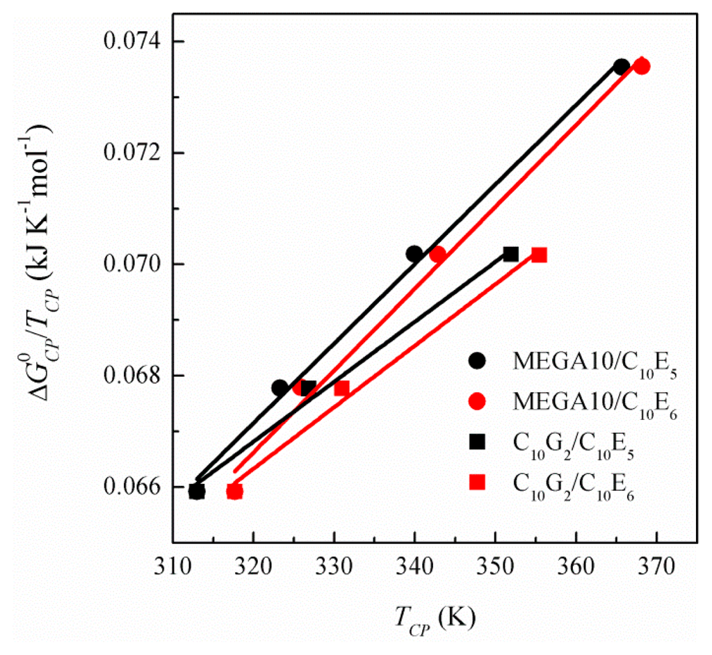 ) and it serves as the basis of comparison for differing examples of compensation behavior. The compensation temperature is a measure of the “dehydration” part of the clouding process [23,25]. The compensation temperature may be regarded as a measure of how much additional heat is required to increase the entropy change by a definite amount. For processes occurring in aqueous micellar solutions, such as phase separation, the hydration-dehydration would contribute to the entropy change [25]. Thus, in this case, the compensation temperature may become a measure of the strength of the surfactant-water interaction; high TC values correspond to strong surfactant-water interactions. On the other hand, the intersection of this compensation plot,