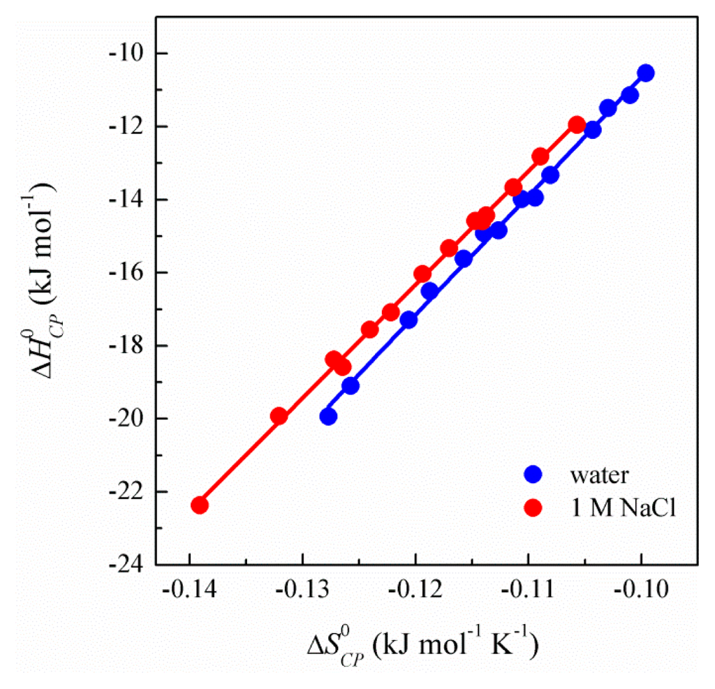 In kinetics and equilibrium studies, an extra thermodynamic linear correlation between the enthalpy and entropy changes is often reported for the process involved, called the enthalpy-entropy compensation effect [26]. The compensation effect is observed when a series of structurally related substrates undergo the same general process or when the process conditions for a single substrate are changed in a systematic way [27]. This phenomenon occurs when parallel enthalpy and entropy changes compensate each other to produce minor changes in the free energy of the process. This compensation has proven to be rather common for processes or reactions occurring in aqueous media such as oxidation-reduction, hydrolysis, micellization, protein unfolding, etc. [28,29]. It is generally accepted that the main process responsible for the compensation phenomenon is the reorganization of water molecules [30].
