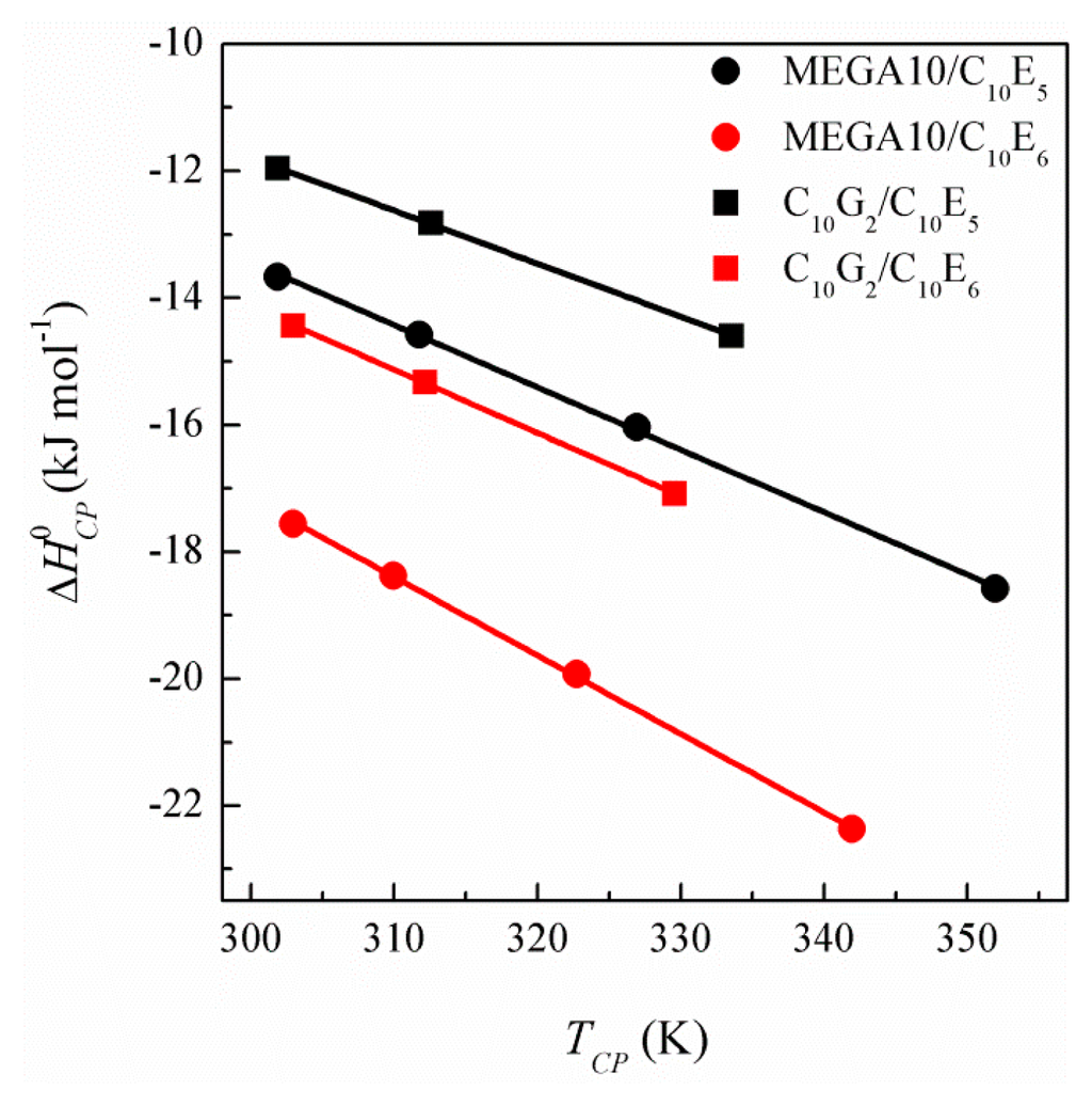 Enthalpy change as a function of cloud point temperature for MEGA-10/C10E5, MEGA-10/C10E6, C10G2/C10E5 and C10G2/C10E6 systems in pure water.
