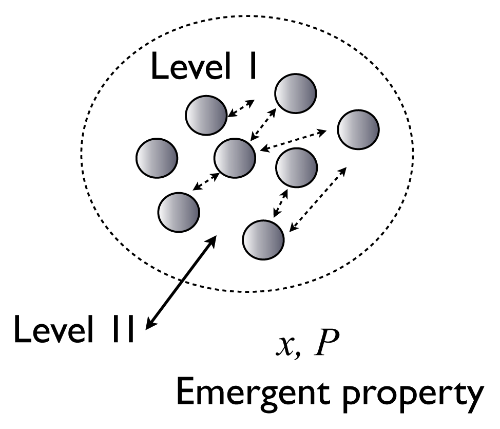 Sketch of an emergent property. At level I interactions occur. When describing the entity at level II, a new property appears. This property must have an associated set of data x and the probability distribution P that produce it.