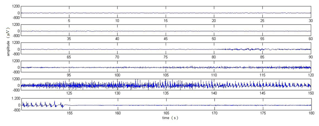 According to physician diagnosis, the epileptic seizure starts at about to 81 s with a “discharge” of slow waves superposed by fast ones with lower amplitude. This discharge lasts approximately 8 s and has a mean amplitude of 100 μV. Afterwards, the seizure spreads, making the analysis of the EEG more complicated, due to muscle artefacts; however, it is possible to establish the beginning of the clonic phase at around 125 s, and the end of the seizure at 155 s, where one encounters an abrupt decay of the signal’s amplitude.