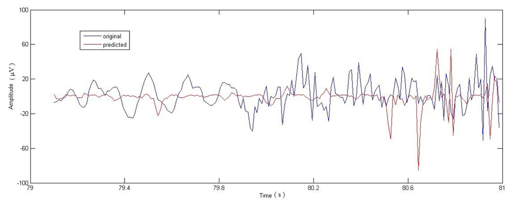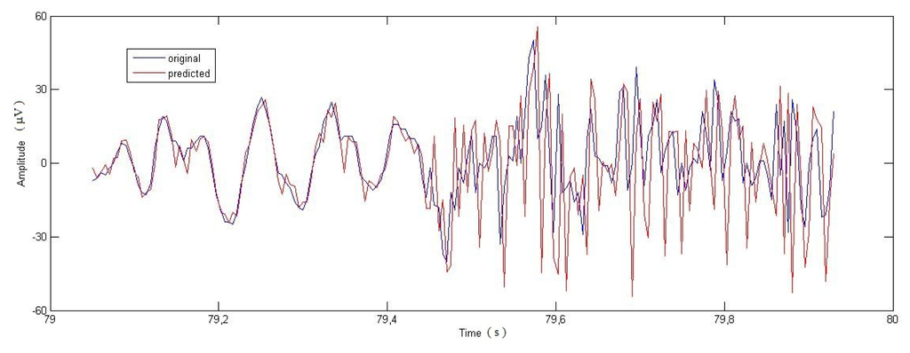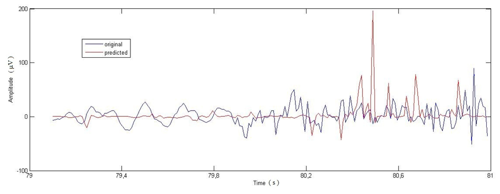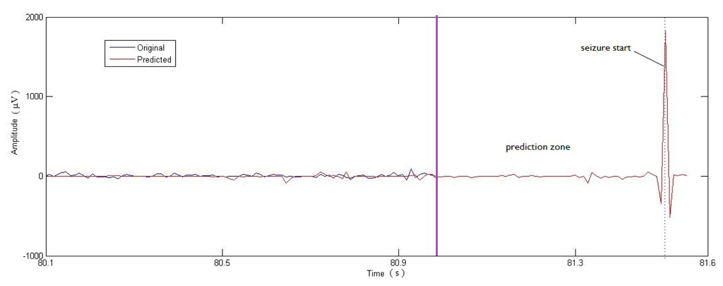 In Figure 2, 81 seconds that encompass the preseizure stage taken from the original EEG series are displayed together with the MEP prediction. A zoom of the seizure start is presented in Figure 3 to show the prediction clearly. From t = 81 s to t = 81.6 s only predicted values are shown (prediction zone). It is important to note that the value of the anticipation time T allows one to predict the seizure start (ts = 81.5 s) one second before it happens.