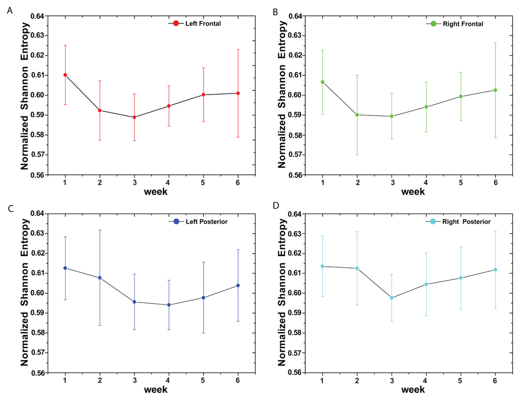 Figure 1. Normalized permutation Shannon Entropy versus the maturation week (average values and standard deviation estimated considering the 24 chickens). The used pdf Bandt–Pompe parameters are D = 6 and τ = 1. (A) Left frontal electrode. (B) Right frontal electrode. (C) Left posterior electrode. (D) Right posterior electrode.