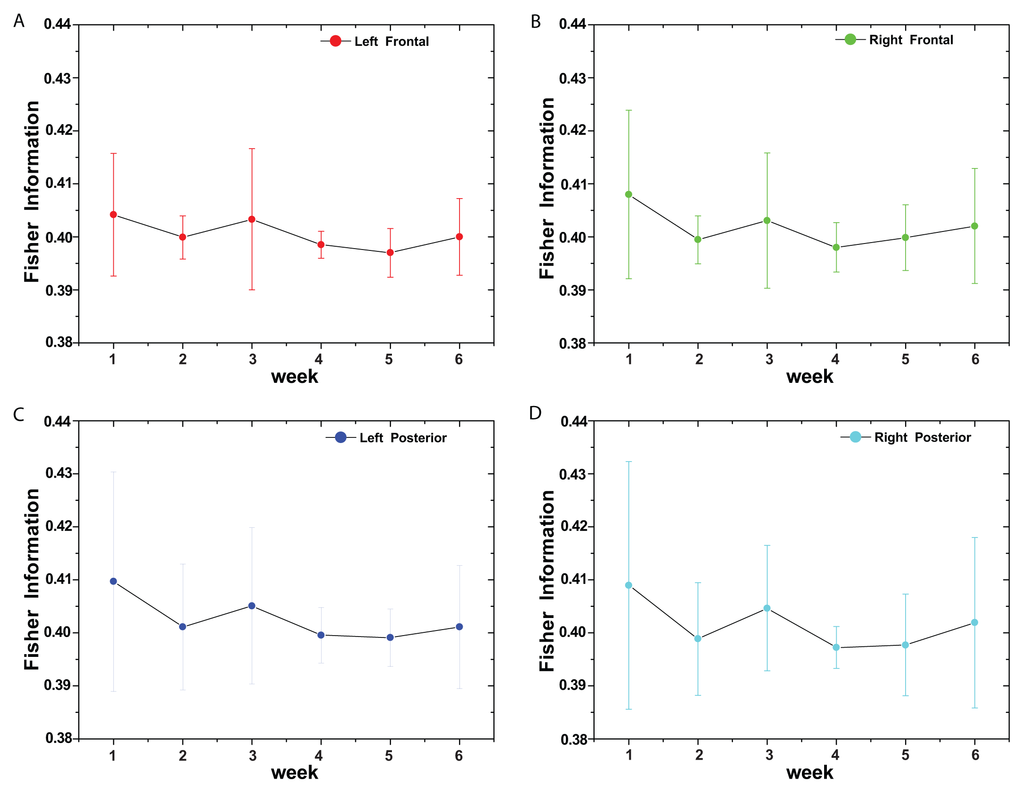 Figure 2. Permutation Fisher information versus the maturation week (average values and standard deviation estimated considering the 24 chickens). The used pdf Bandt–Pompe parameters are D = 6 and τ = 1. (A) Left frontal electrode. (B) Right frontal electrode. (C) Left posterior electrode. (D) Right posterior electrode.