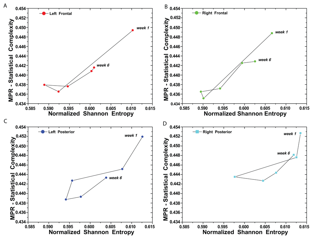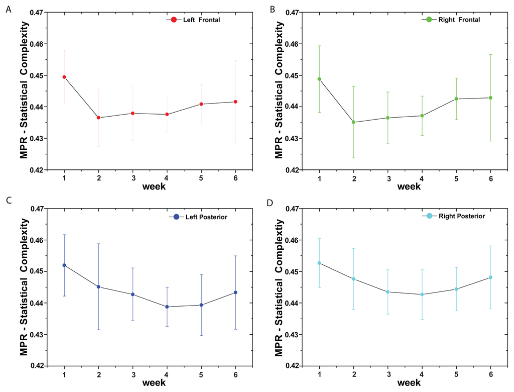 Figure 3. MPRpermutation statistical complexity versus the maturation week (average values and standard deviation estimated considering the 24 chickens). The used pdf Bandt–Pompe parameters are D = 6 and τ = 1. (A) Left frontal electrode. (B) Right frontal electrode. (C) Left posterior electrode. (D) Right posterior electrode.