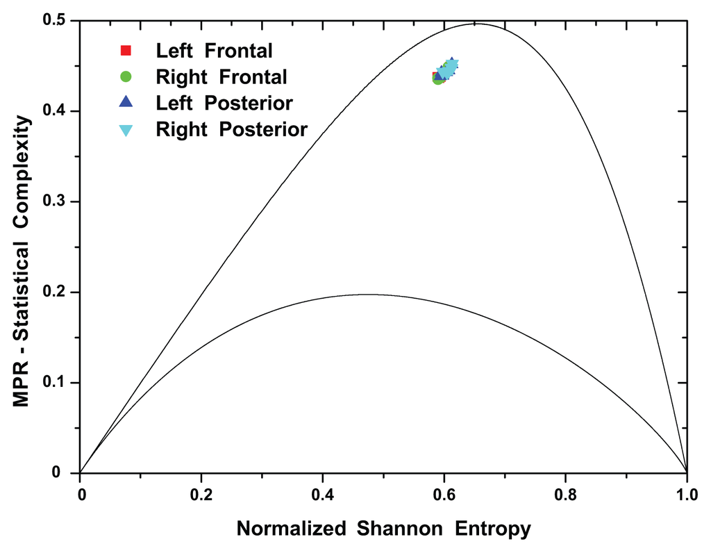 MPR permutation complexity is a measure derived from nonlinear systems theory that, when applied to EEG signals, can be indicative of the global dynamical complexity of electrocortical activity. However, to obtain further understanding of our results, we need to plot the localization in the causality entropy-complexity plane of the results obtained in the present work. Figure 5 displays all of the results considered here in the causality entropy-complexity plane H×C location. The continuous lines represent the curves of maximum and minimum statistical complexity, Cmax and Cmin, respectively, as functions of the normalized Shannon entropy [40]. A closer look reveals that our results are in the chaotic attractors zone, corresponding to the localization of a dissipative chaotic system. As can be appreciated from the contrast of our results with the one being shown in [42], in which the Bandt–Pompe pdf was evaluated considering D = 6 (pattern length), τ = 1 (time lag), our results correspond to the localization of a chaotic dissipative system: the Tinkerbell map X-component [42].