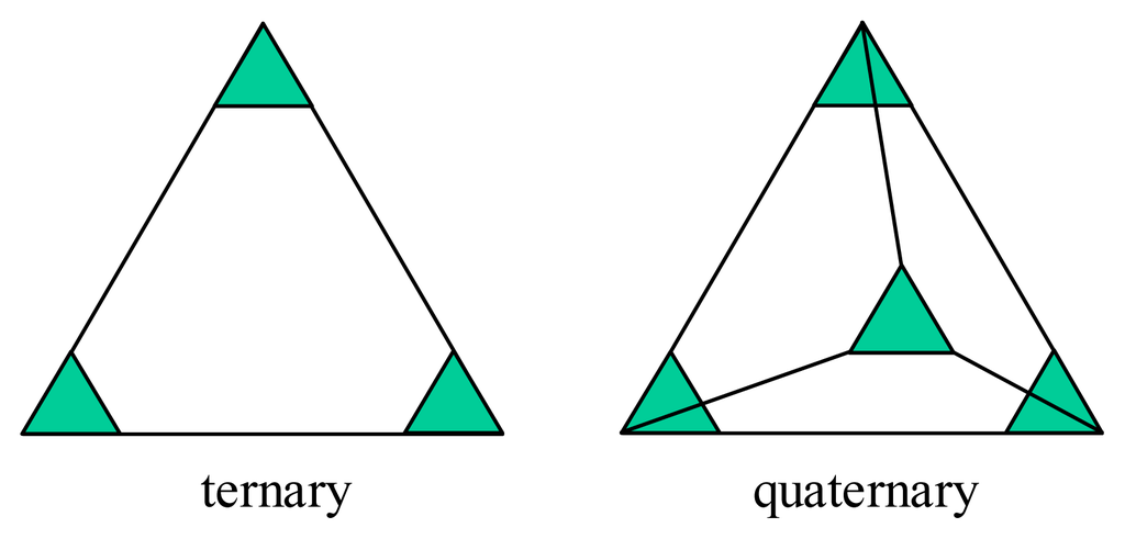 Schematic ternary and quaternary systems, showing regions of the phase diagram which are relatively well known (green) near the corners, and relatively less well known (white) near the centre [2].