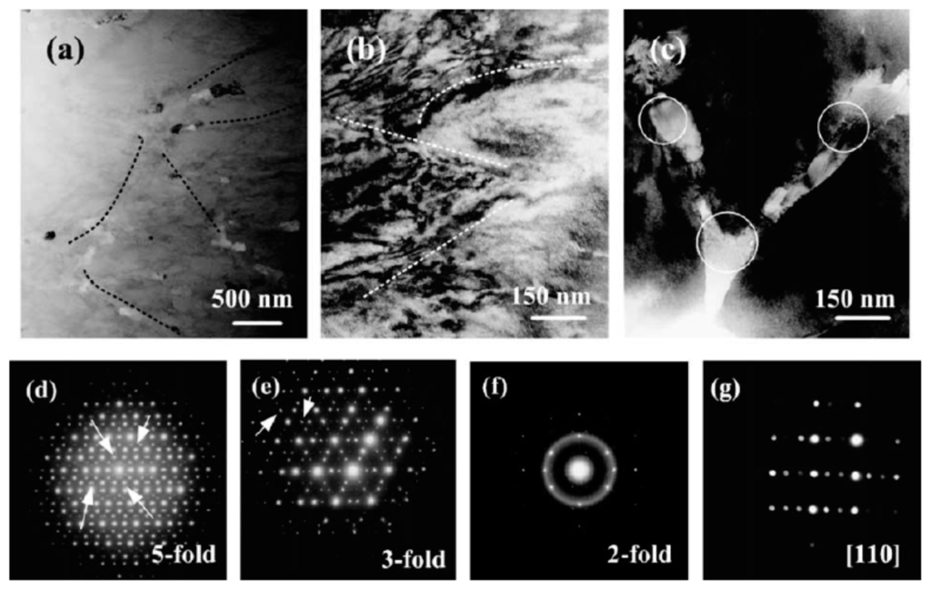 Mixture of nanoscale Zr2Cu-type crystalline, amorphous and icosahedral phases in chill cast (Ti33Zr33Hf33)70(Ni50Cu50)20Al10: (a–c) bright field TEM; and (d–g) selected area diffraction patterns [25].