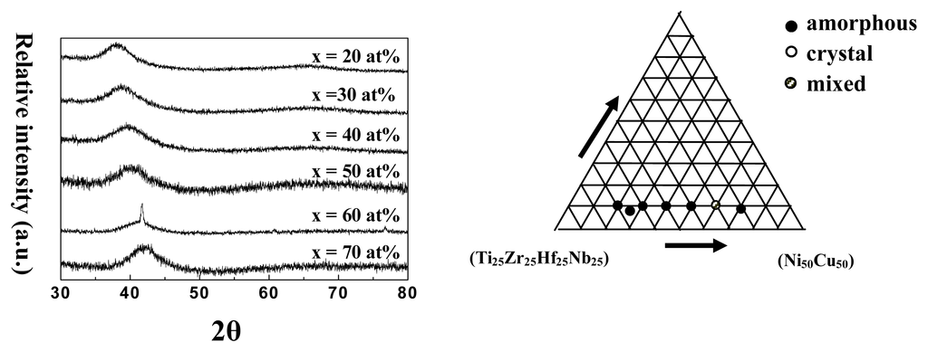 X-ray diffractograms and corresponding ternary phase diagram from melt spun (Ti25Zr25Hf25Nb25)90−x(Ni50Cu50)xAl10 alloys [28].