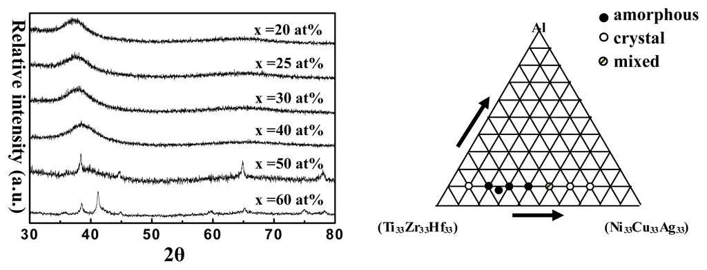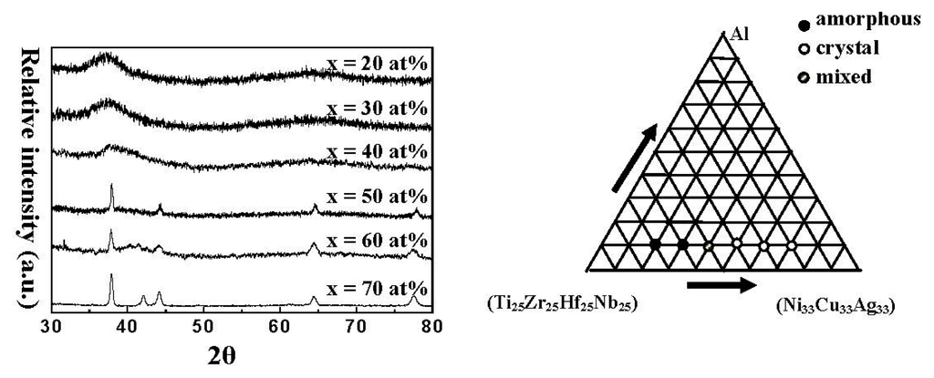 X-ray diffractograms and corresponding ternary phase diagram from melt spun (Ti25Zr25Hf25Nb25)90−x(Ni33Cu33Ag33)xAl10 alloys [28].