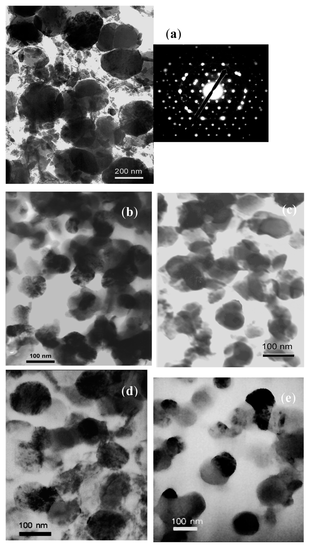 Galano, Audebert, Stone, Prima, Tomut and Cantor [35–45] investigated the structure of a wide range of melt spun alloys in the AlFeCrTiVNbTa system. The alloys were based on the generic formula Al93Fe3Cr2ETM2 where ETM is an early transition metal. The as-melt spun alloys consisted mainly of nanoscale icosahedral particles embedded in an fcc Al matrix, as shown in Figures 15 and 16 for (a) Al93(Fe3Cr2)7, (b) Al93Fe3Cr2Ti2, (c) Al93Fe3Cr2V2, (d) Al93Fe3Cr2Nb2 and (e) Al93Fe3Cr2Ta2. The Ti, V and Ta alloys also contained a few small particles of crystalline intermetallic Al13Cr2, and the Nb alloy contained a small fraction of Al3Nb. The ternary alloy had the largest icosahedral particle size, ~200 nm, which reduced to 70–100 nm for the Ti, V, Nb and Ta alloys.