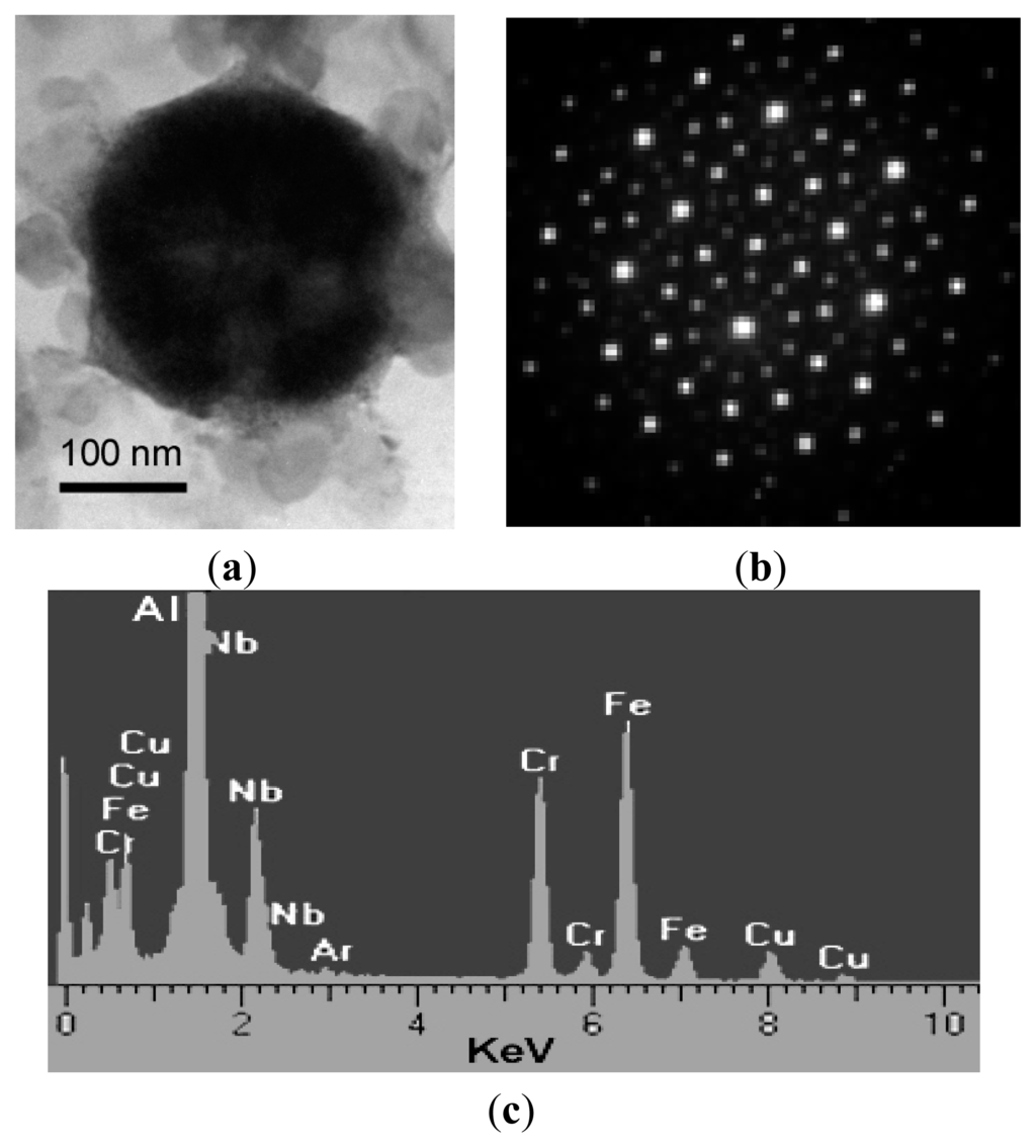 Icosahedral particle embedded in an fcc Al matrix in melt spun Al93Fe3Cr2Nb2: (a) transmission electron micrograph; (b) electron diffraction pattern; and (c) energy dispersive X-ray analysis [37].