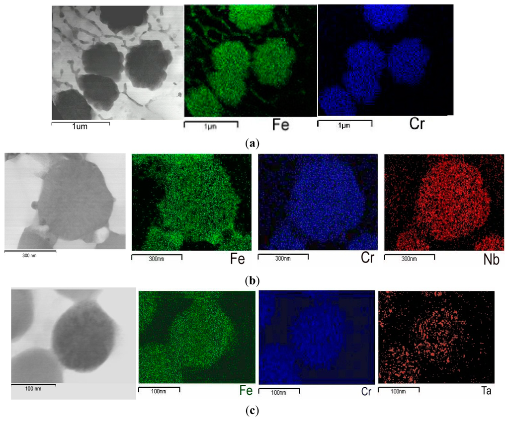 Bright field STEM images and corresponding EDX maps from: (a) Al93(Fe3Cr2)7; (b) Al93Fe3Cr2Nb2; and (c) Al93Fe3Cr2Ta2 alloys after heat treatment for 30 min at 450 °C [42].